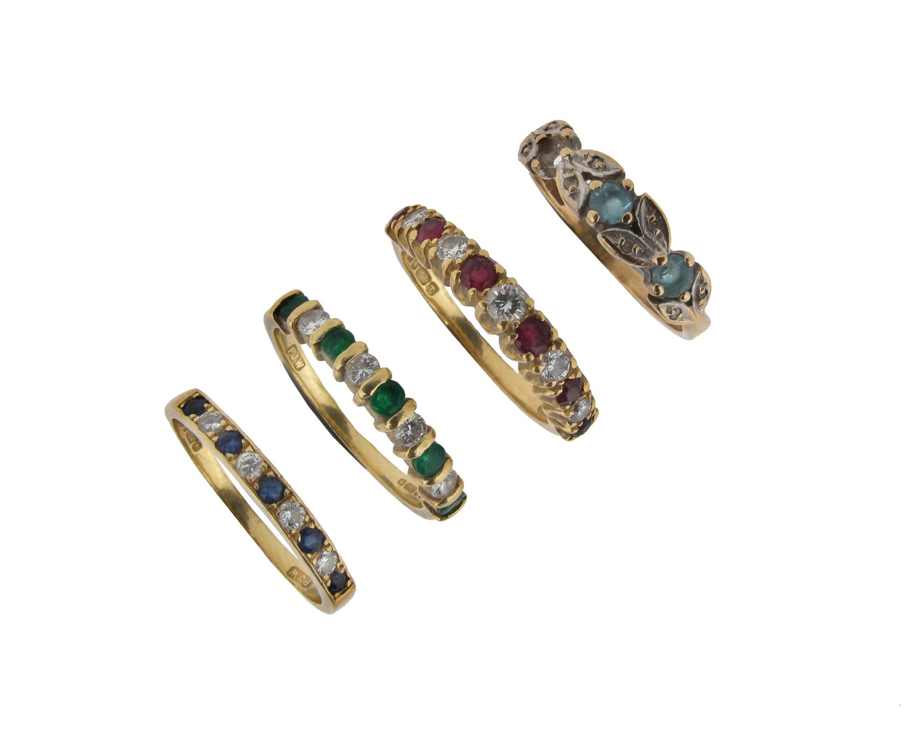 Four assorted diamond and gem stone set gold rings, 7g in total.