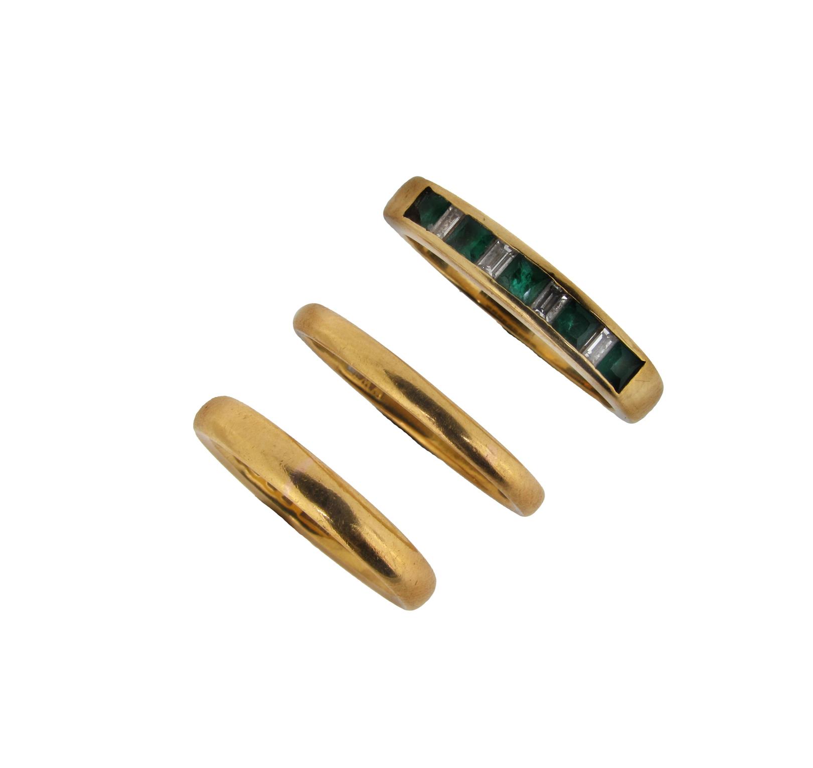 An 18ct yellow gold ring alternately set with five rectangular shaped emeralds (one chipped) and four baguette shaped diamonds. Size V. And two 22ct gold wedding rings (9g).
