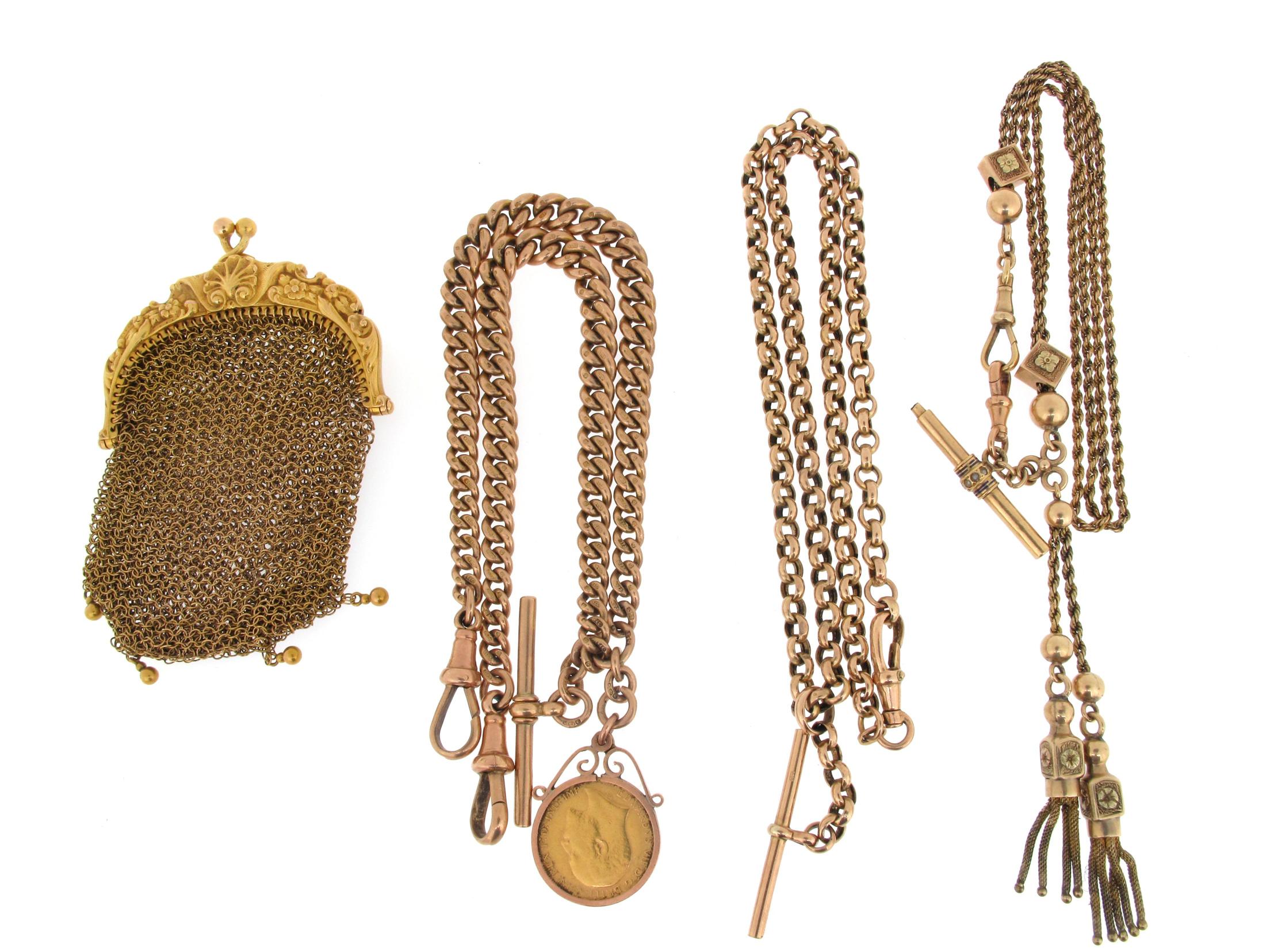A small gold mesh purse, a 9ct gold graduated curb link watch chain with half sovereign pendant, a gold albertina with two tassel pendants and a watch key cum t-bar and a plain belcher link watch chain. 136g in total.