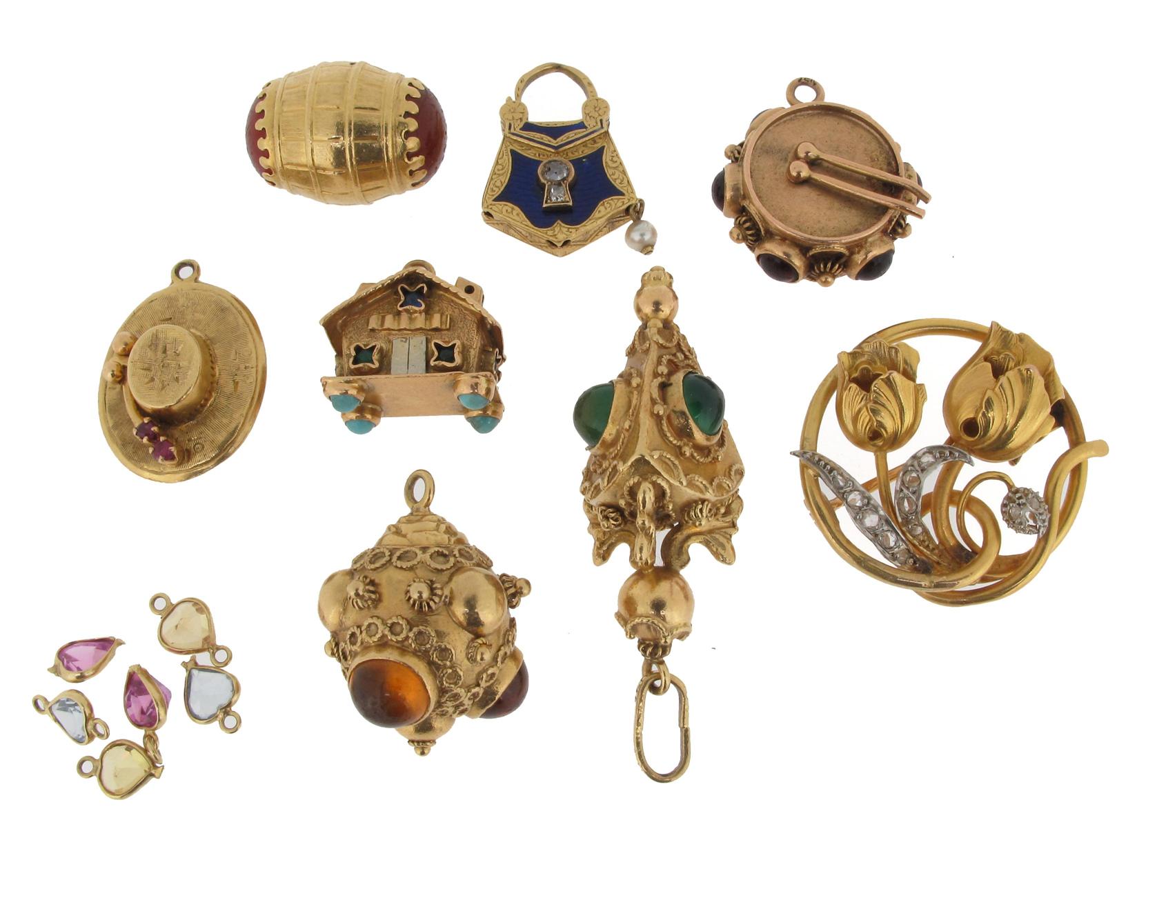 Six assorted stone set gold charms, a French Art Nouveau gold circular floral brooch set with diamonds, a gold padlock form clasp with blue enamel decoration and set with diamonds and six stone set small gold pendants.