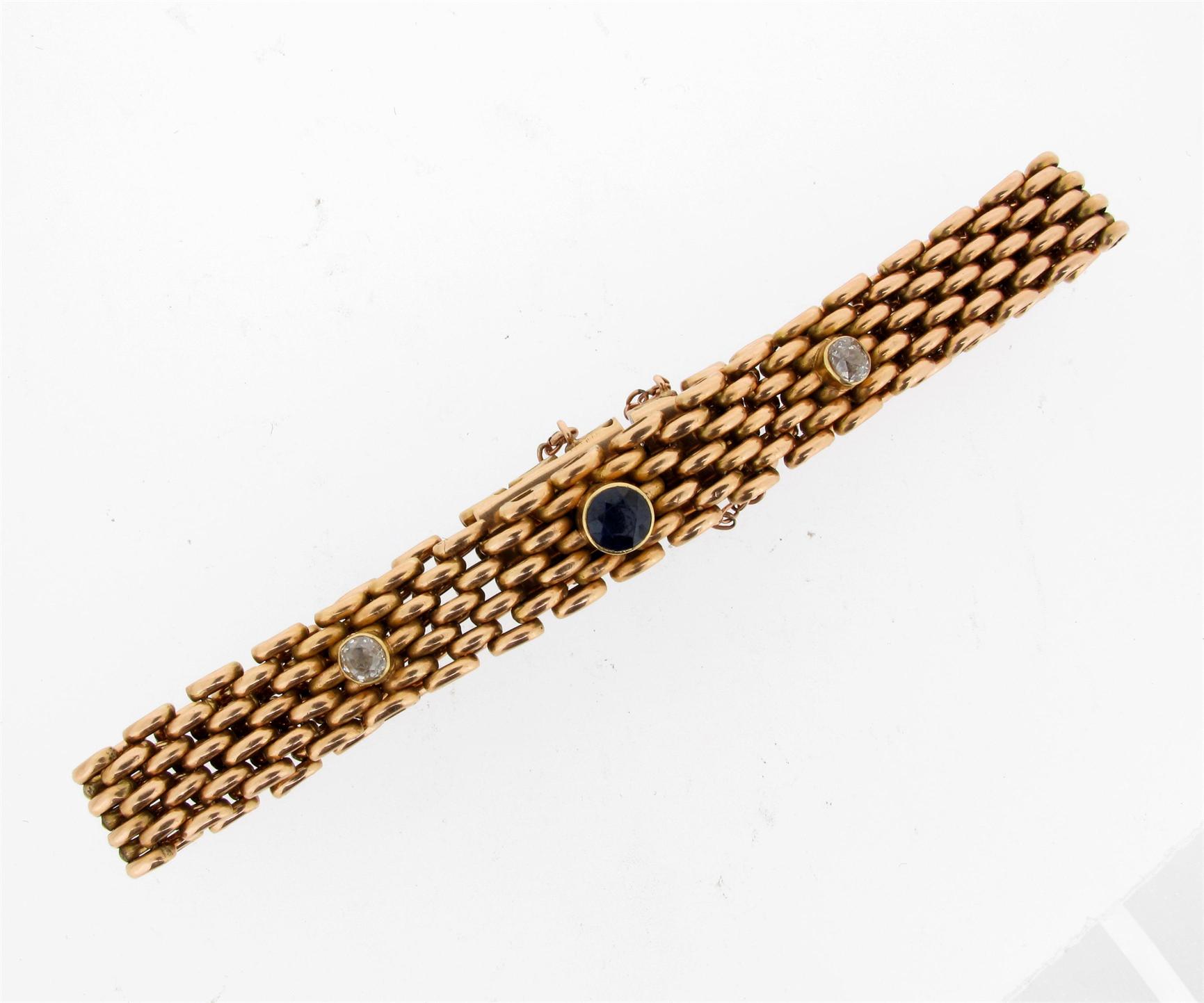 A yellow gold gate link bracelet, set with a sapphire and two diamonds. 22g.