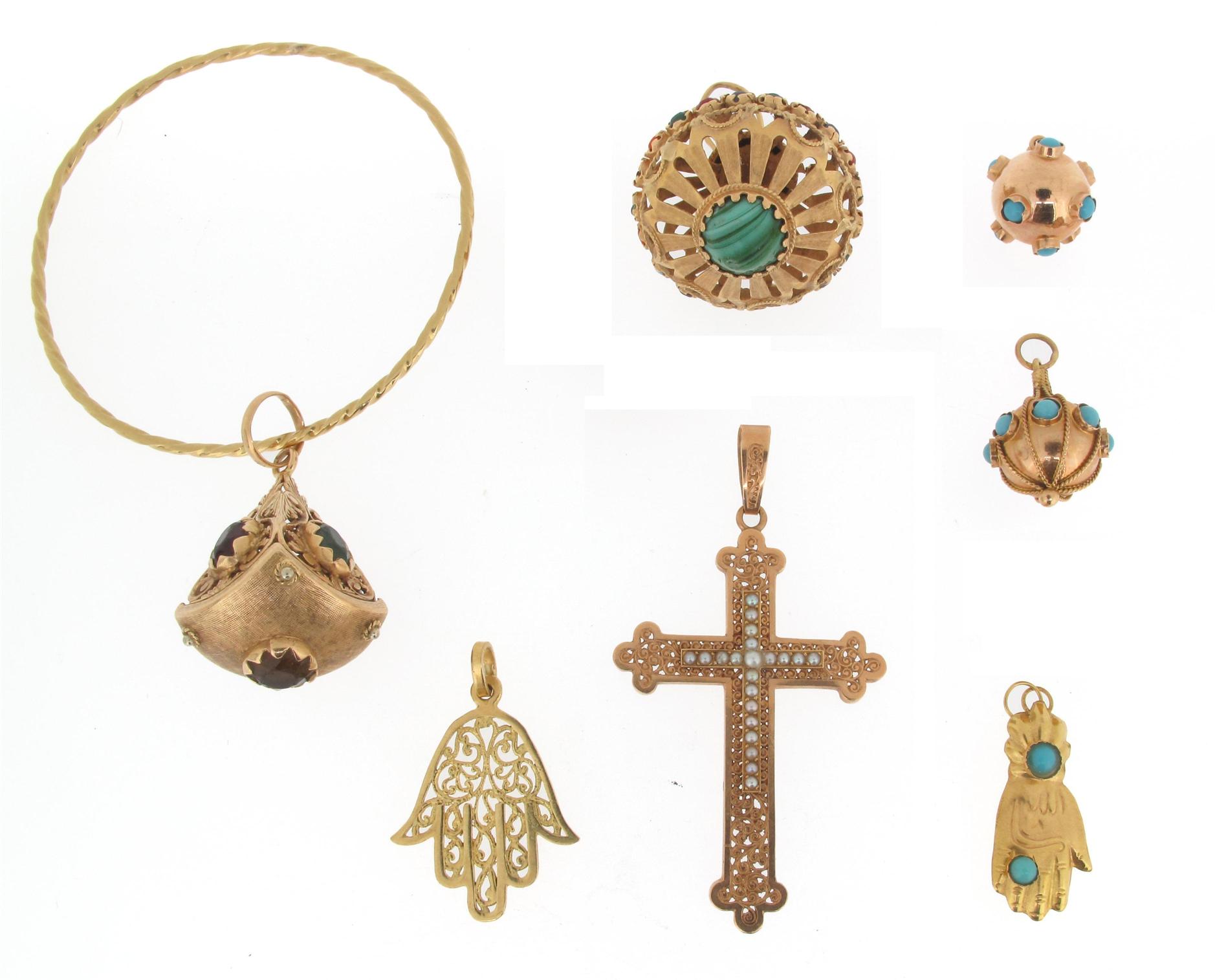 A pierced gold cruciform pendant set with seed pearls, a gold bangle with gold charm and five assorted gold charms. 43g in total.