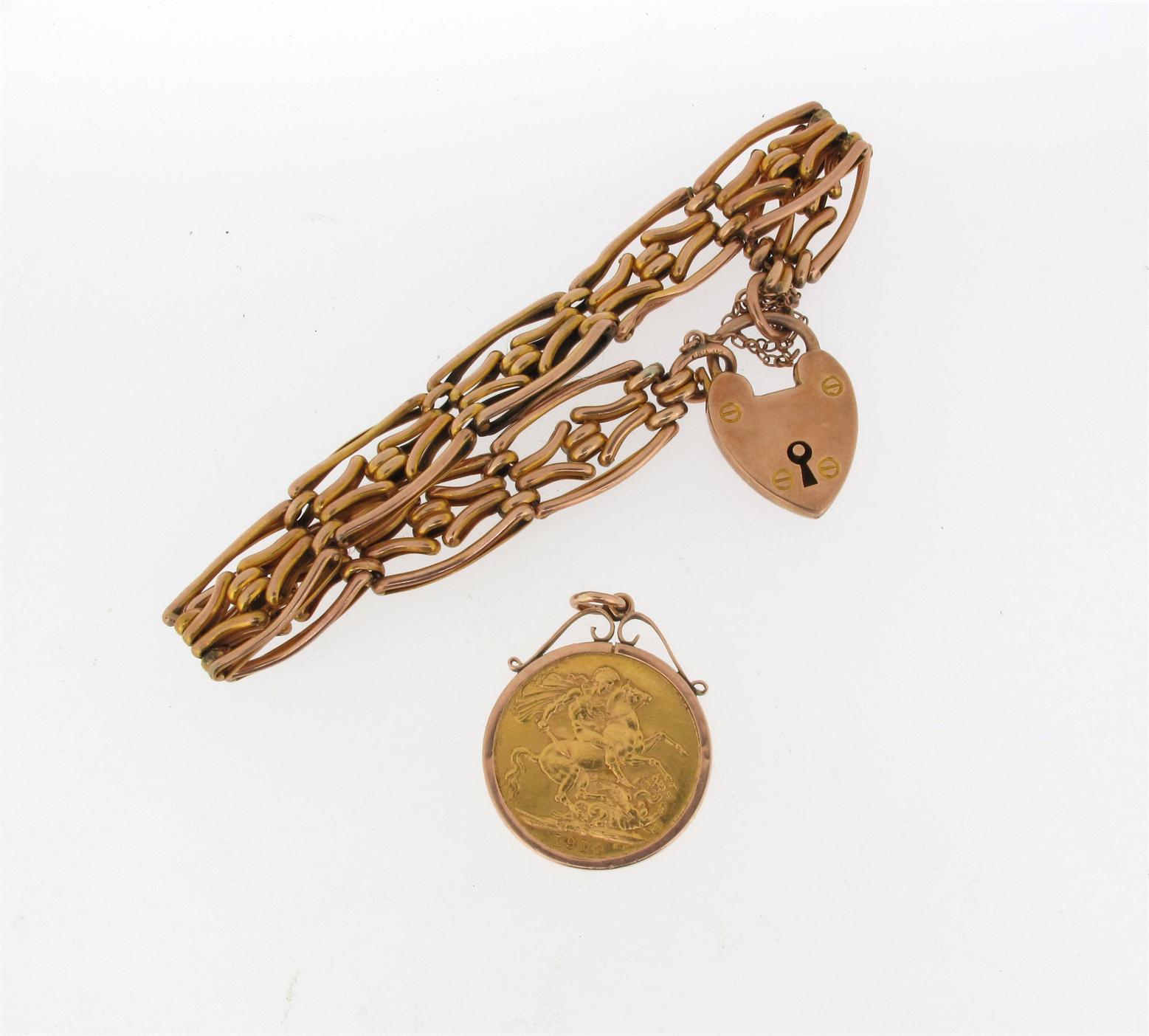 A gold fancy gate link bracelet with a gold padlock clasp, with a sovereign pendant mounted in a gold frame. 23g.