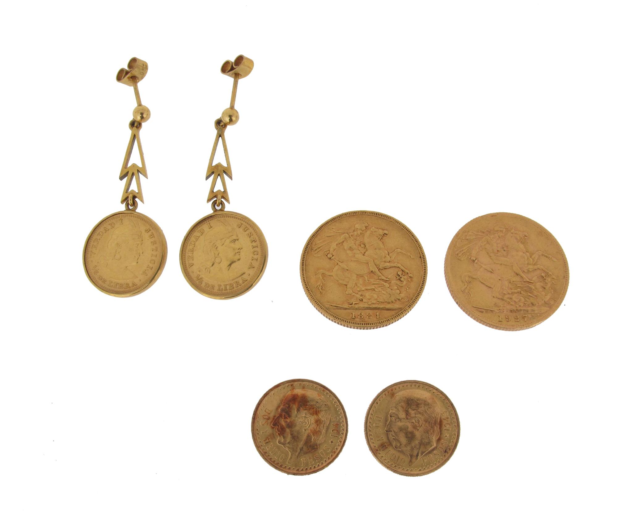 A sovereign, Melbourne 1884, a sovereign, South Africa 1927, two Mexican gold coins and a pair of gold earrings incorporating two Peruvian gold coins.