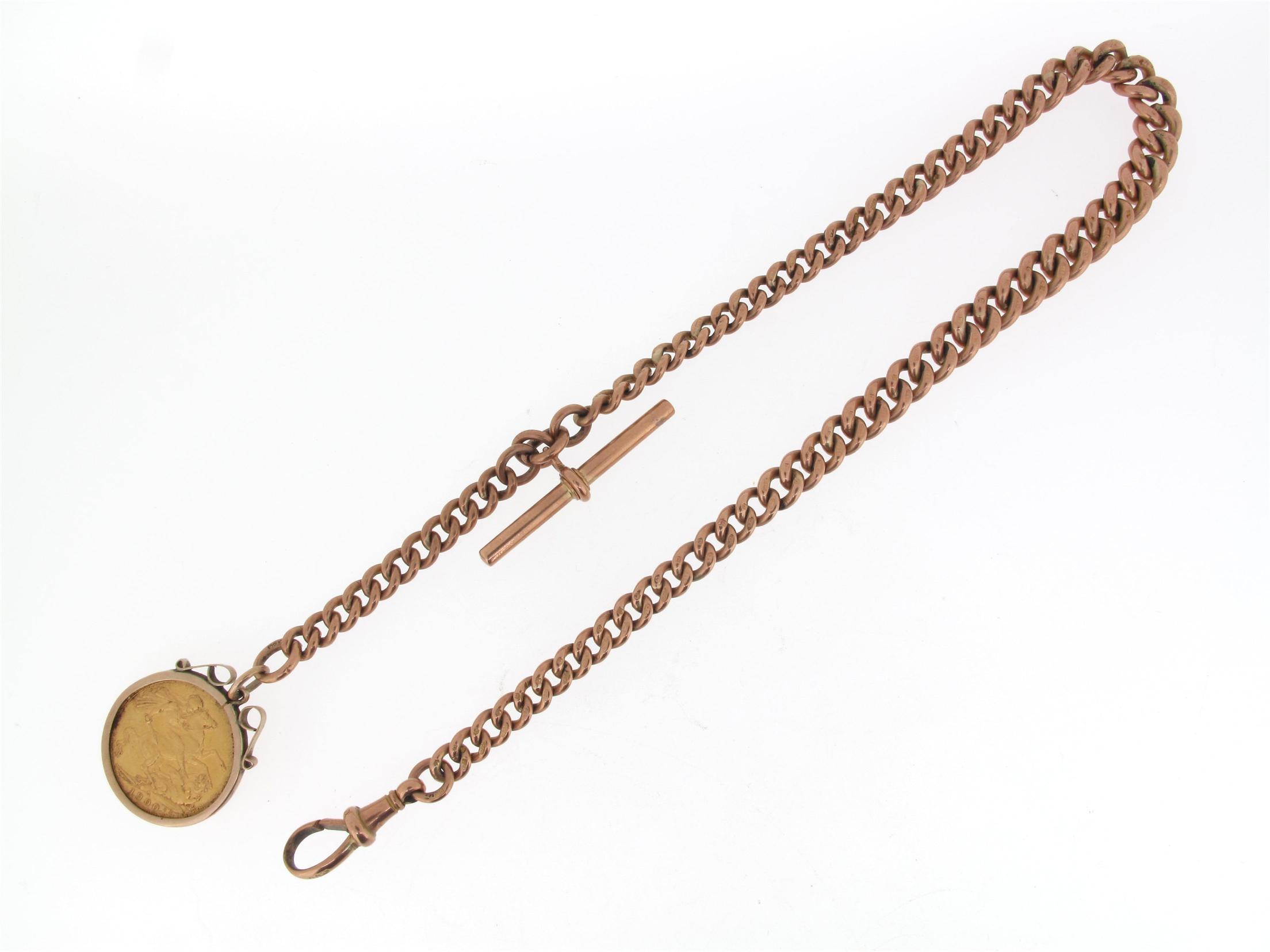 A 9ct gold graduted curb link watch chain with a sovereign mounted gold pendant. 37cm. 55g in total.