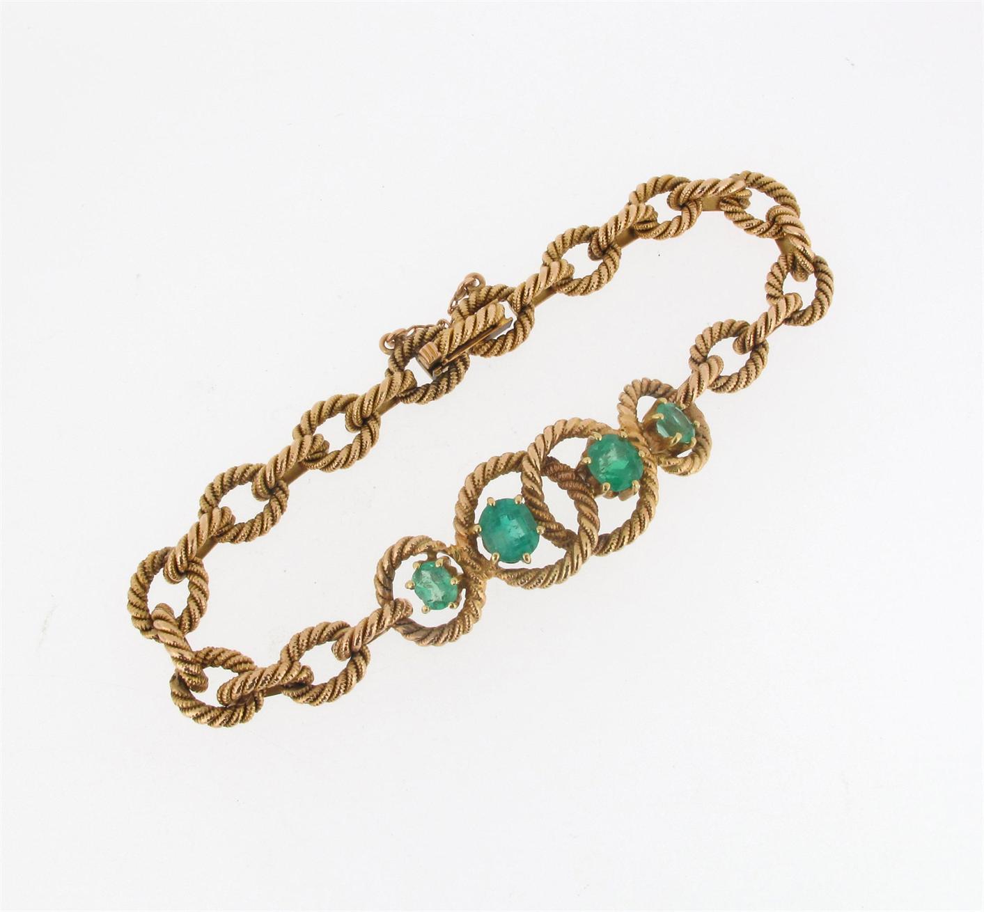A gold twisted rope design bracelet, set with four graduated oval shaped emeralds, 24g in total.