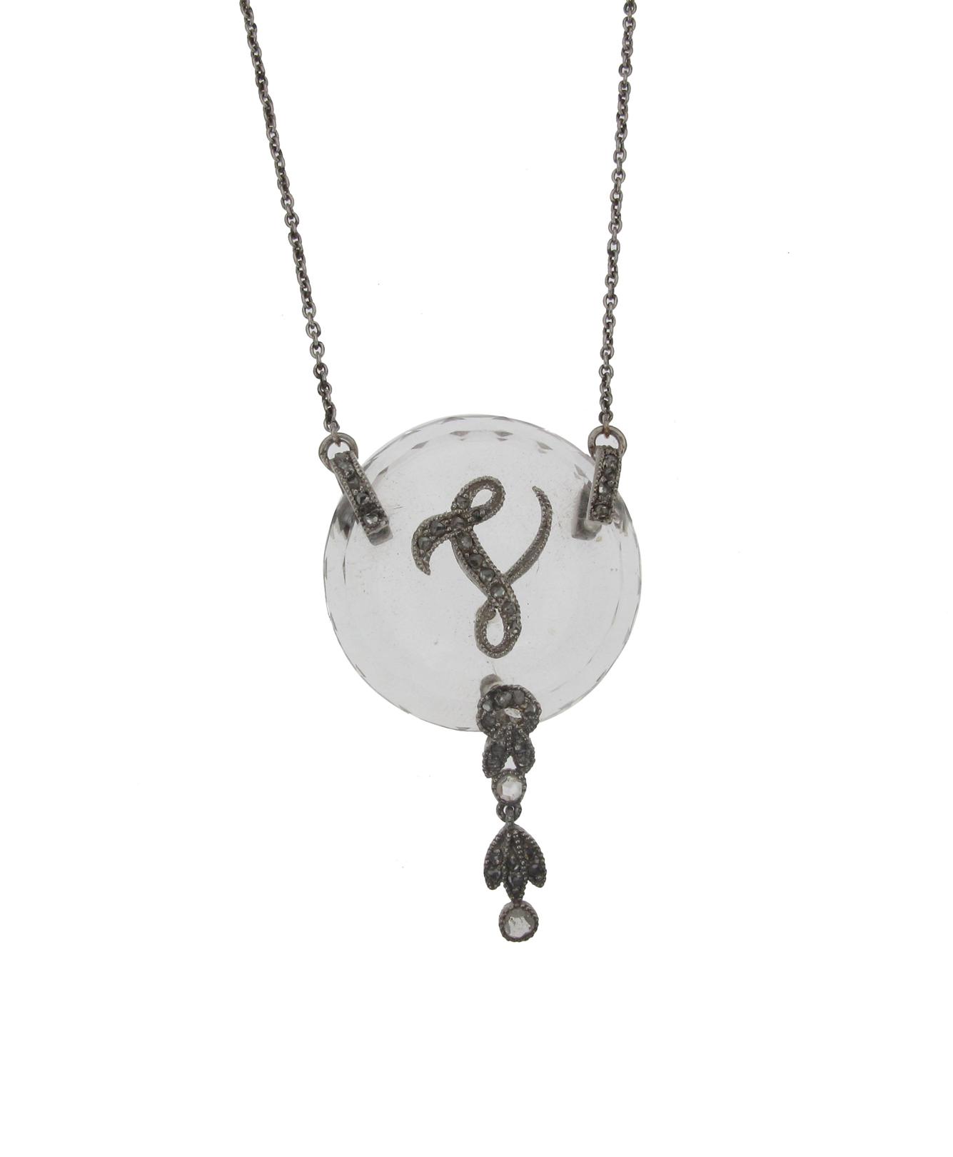 An Edwardian pendant, the circular section of faceted crystal is applied with a diamond set initial. Suspending smaller diamonds and on a fine link platinum neck chain. Associated box.