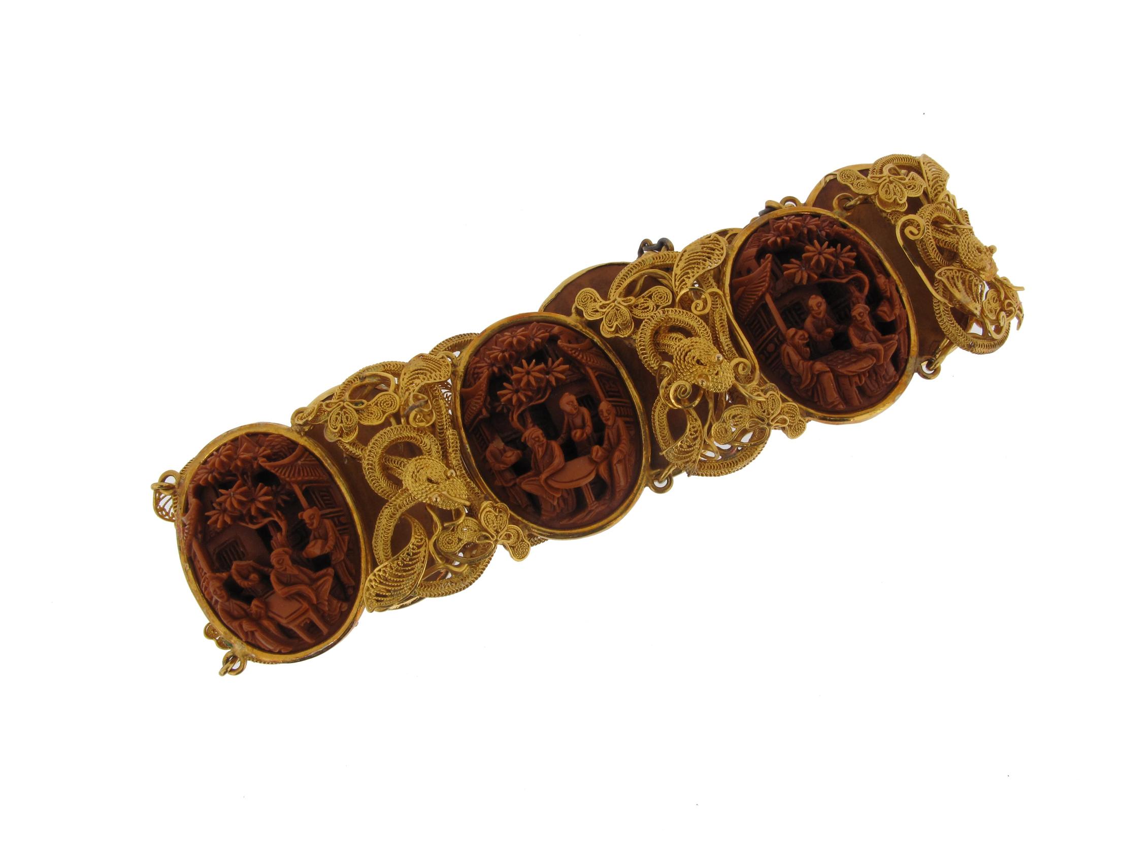 A Chinese bracelet, incorporating finely carved sections joined with fine gold work links.