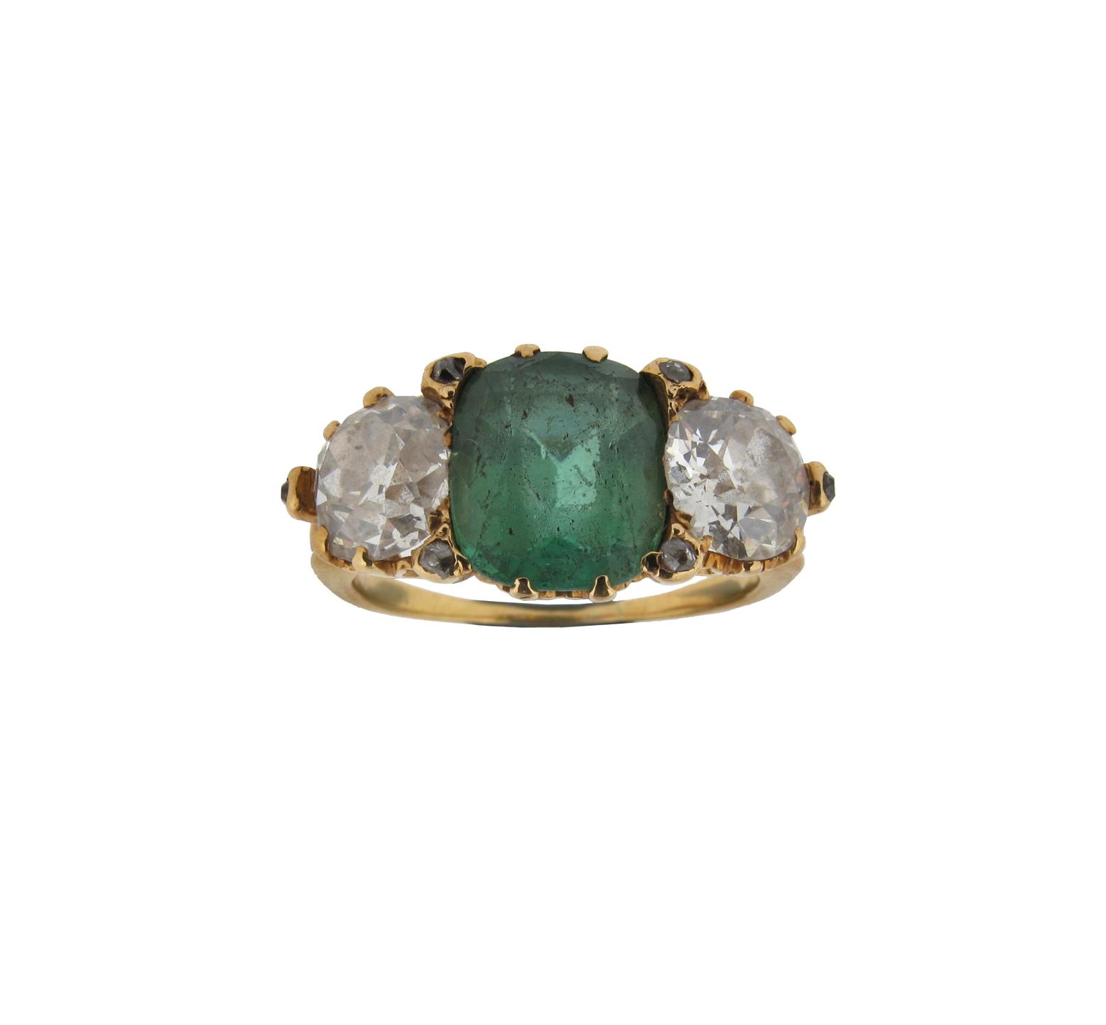 A green stone and diamond three stone ring, the centre cushion shaped green stone is set with two old circular cut diamonds in yellow gold. Pierced mount. Size M 1/2.