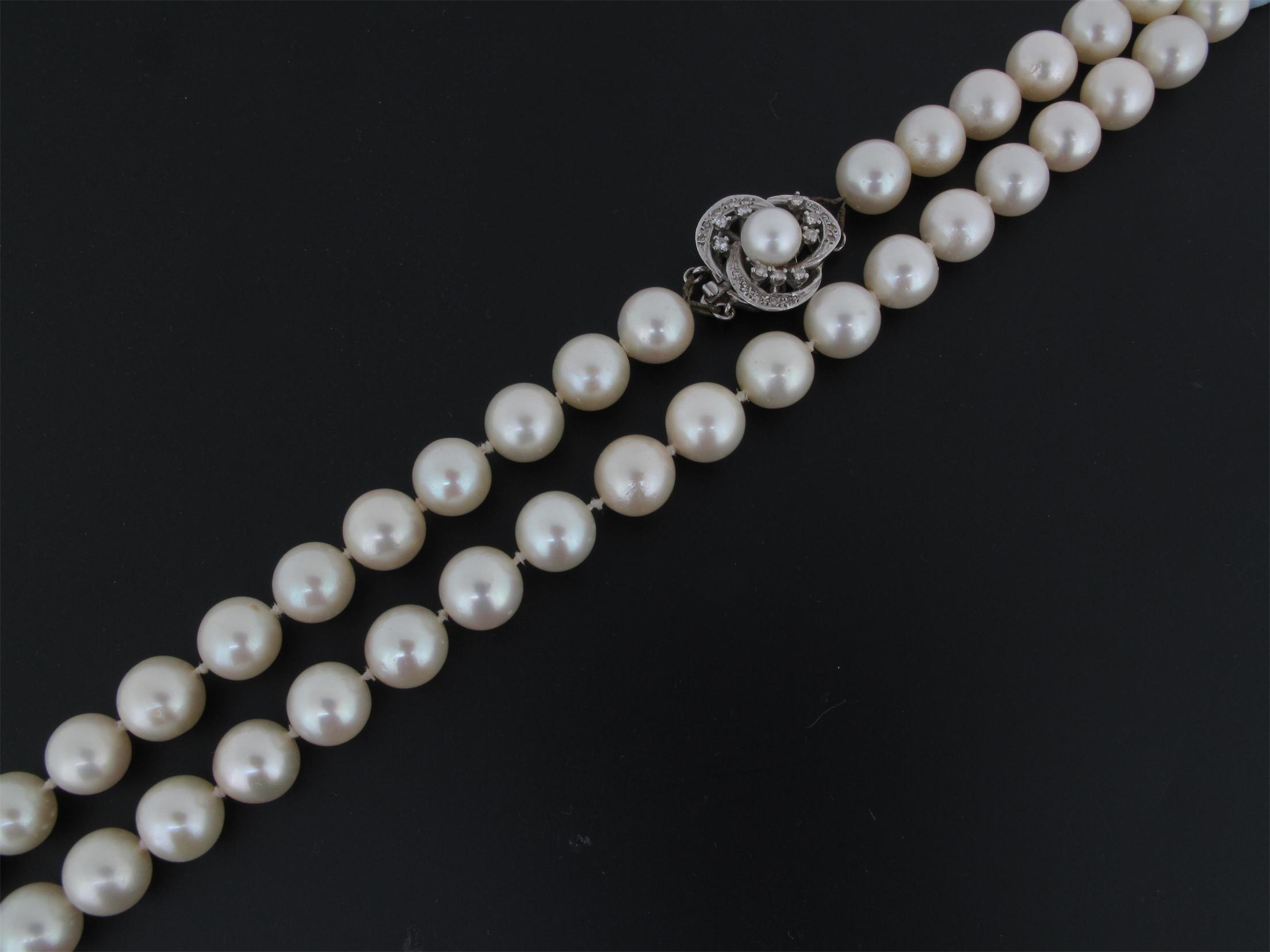 A single row matched cultured pearl necklace, the pearls measure approximately 9.0mm. The white gold clasp set with graduted circular cut diamonds and a smaller cultured pearl. 82cm.