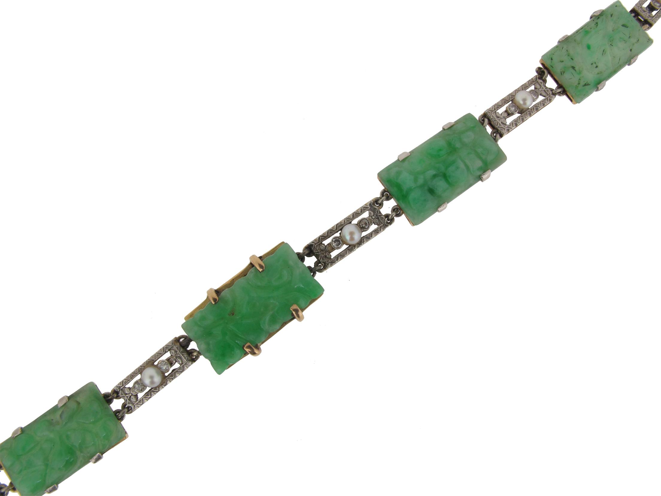 A jade panel bracelet, with alternating seed pearl and diamond links.
