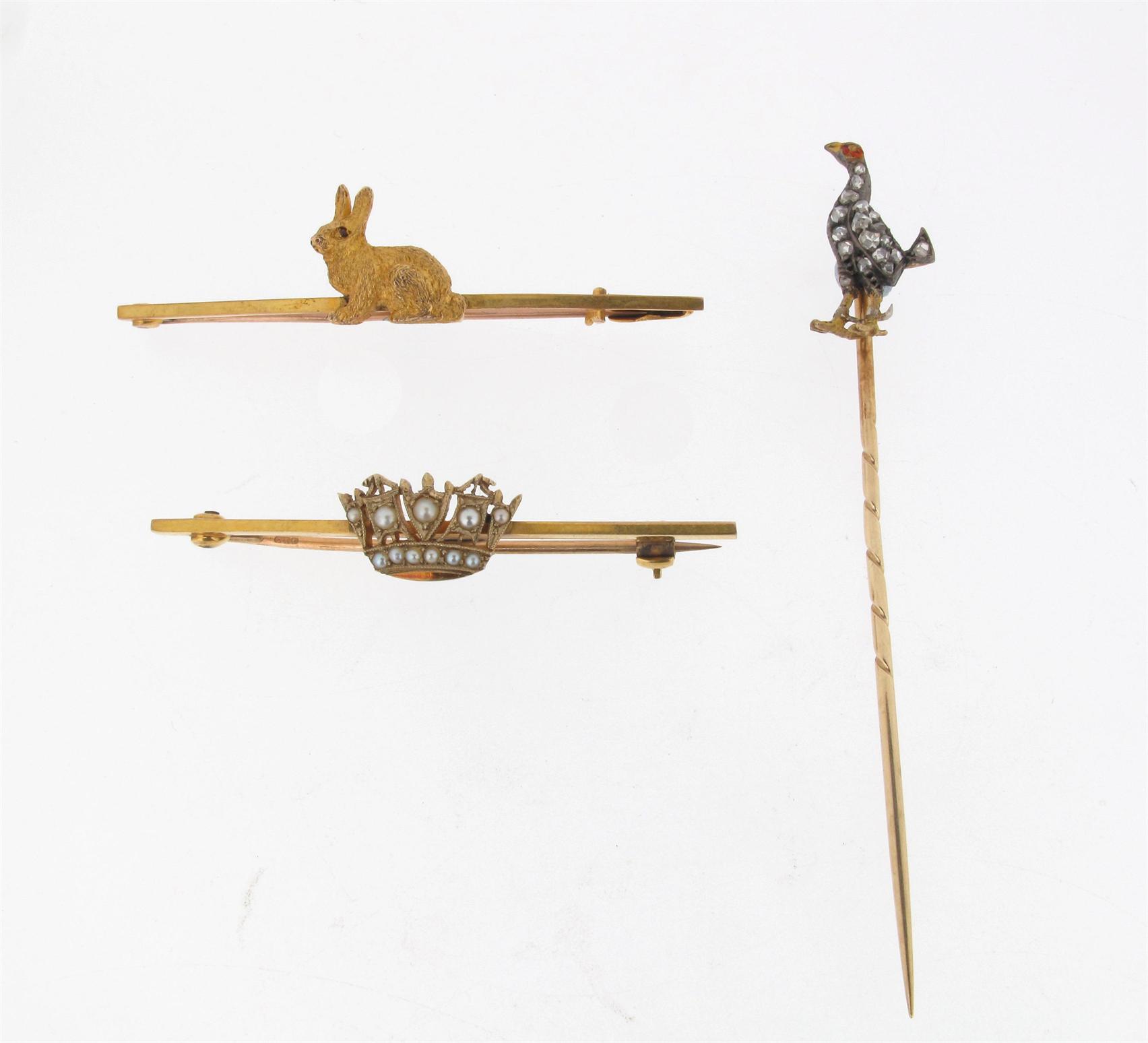 A gold stick pin formed as a fighting cock