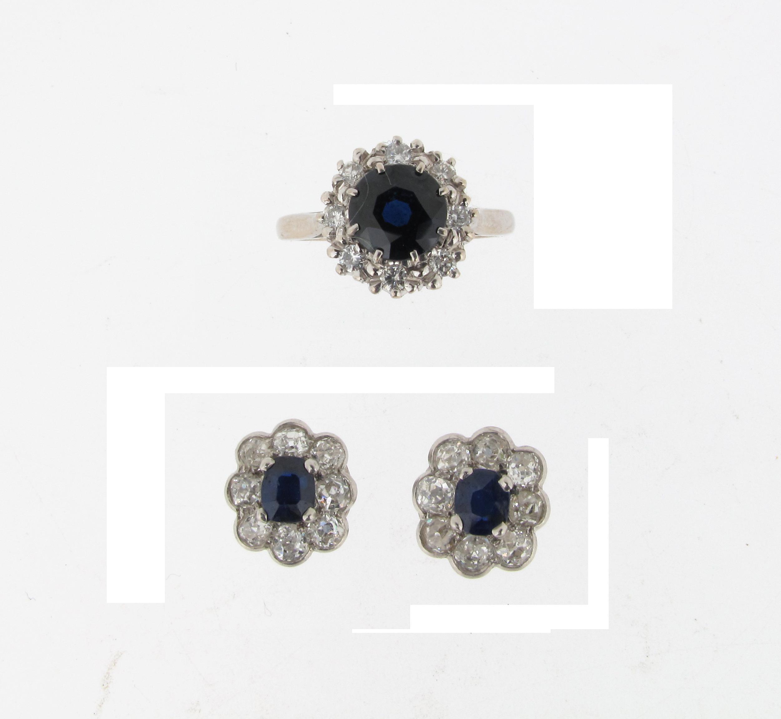 A sapphire and diamond set 18ct white gold cluster ring, with a pair of sapphire and diamond set cluster ear studs. Case.
