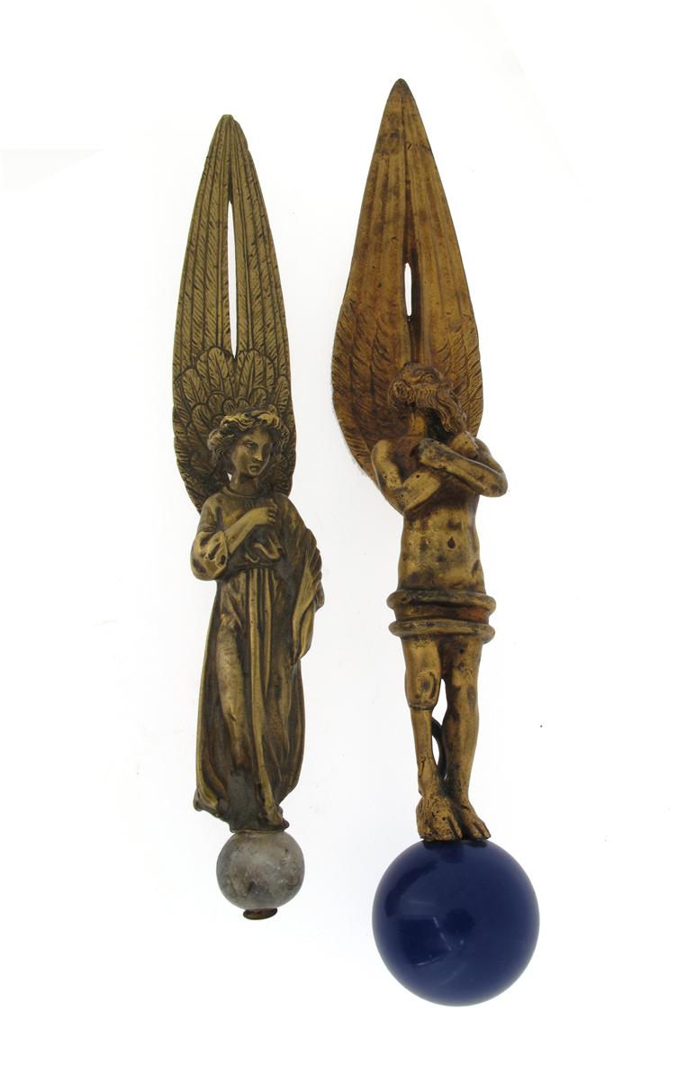 A 19th Century metal letter opener in the form of a standing angel, the raised wings joined at the top and the angel stands on a quartz sphere, 18cm. In the manner of Michaelangelo Caetani who sold items to Castellani. With another metal letter opener in the form of a devil.