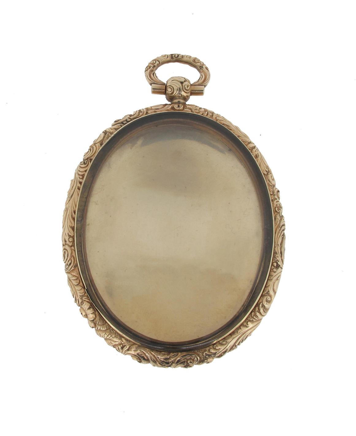 A Regency gold glazed locket pendant, with heavily foliate scroll carved border and hinged reverse opening decorated with engine turned pattern and centred with a vacant cartouche. The glazed locket section 4cm wide by 5cm high.