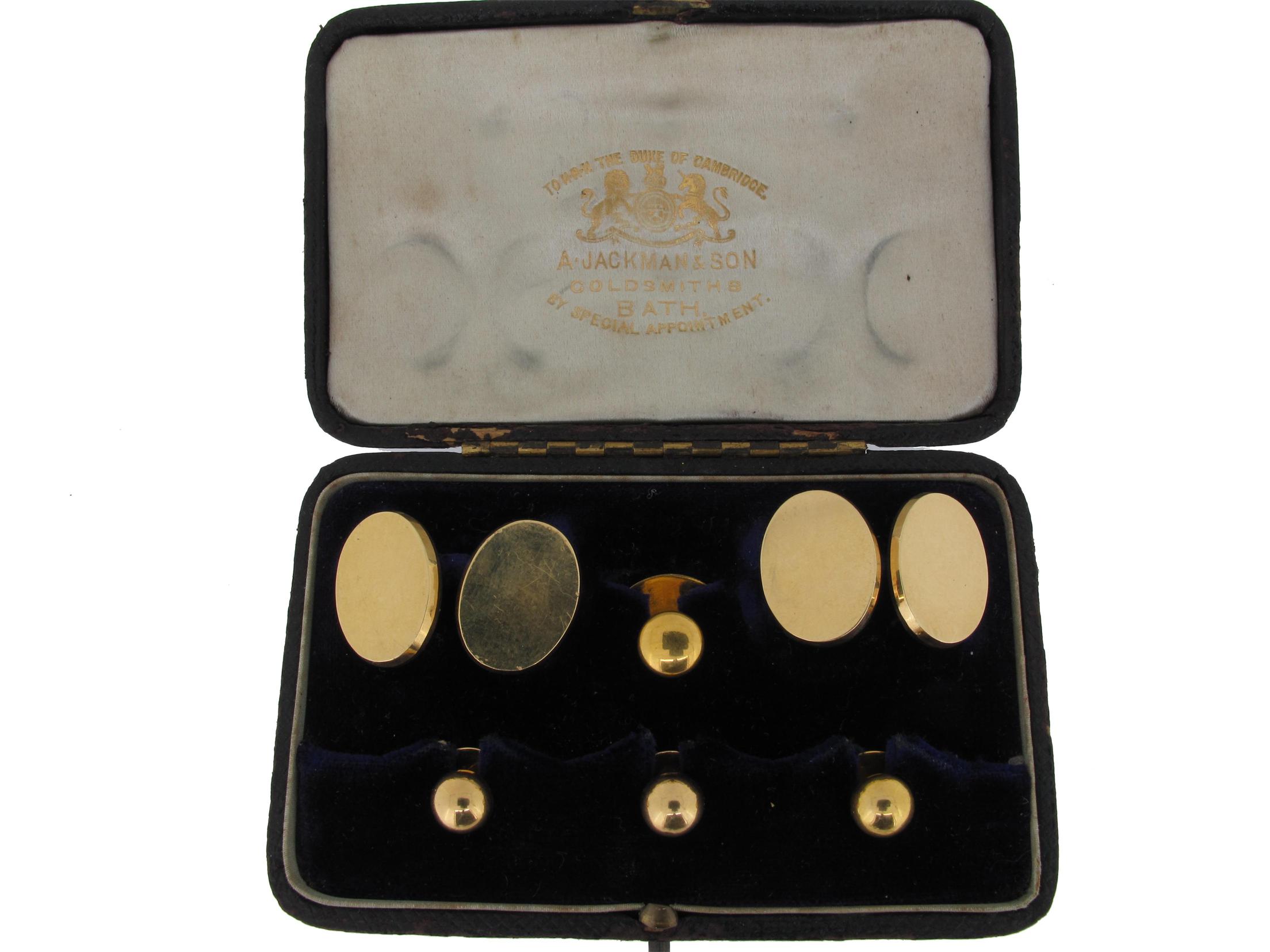 A cased pair of 18ct gold cuff links with four gold studs. The links marked for London, 1924. Fitted case. 38g in total.