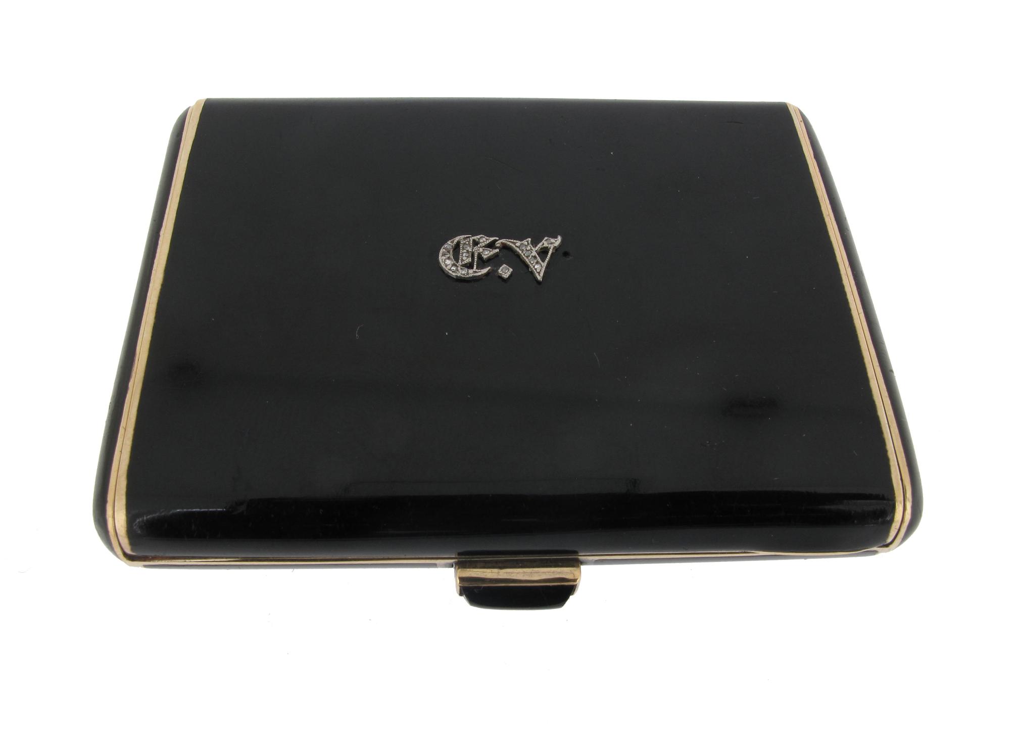 A small rectangular silver gilt minaudiere with black enamel decoration overall, the hinged cover applied with diamond set initials. Black onyx thumb piece. 7cm wide.