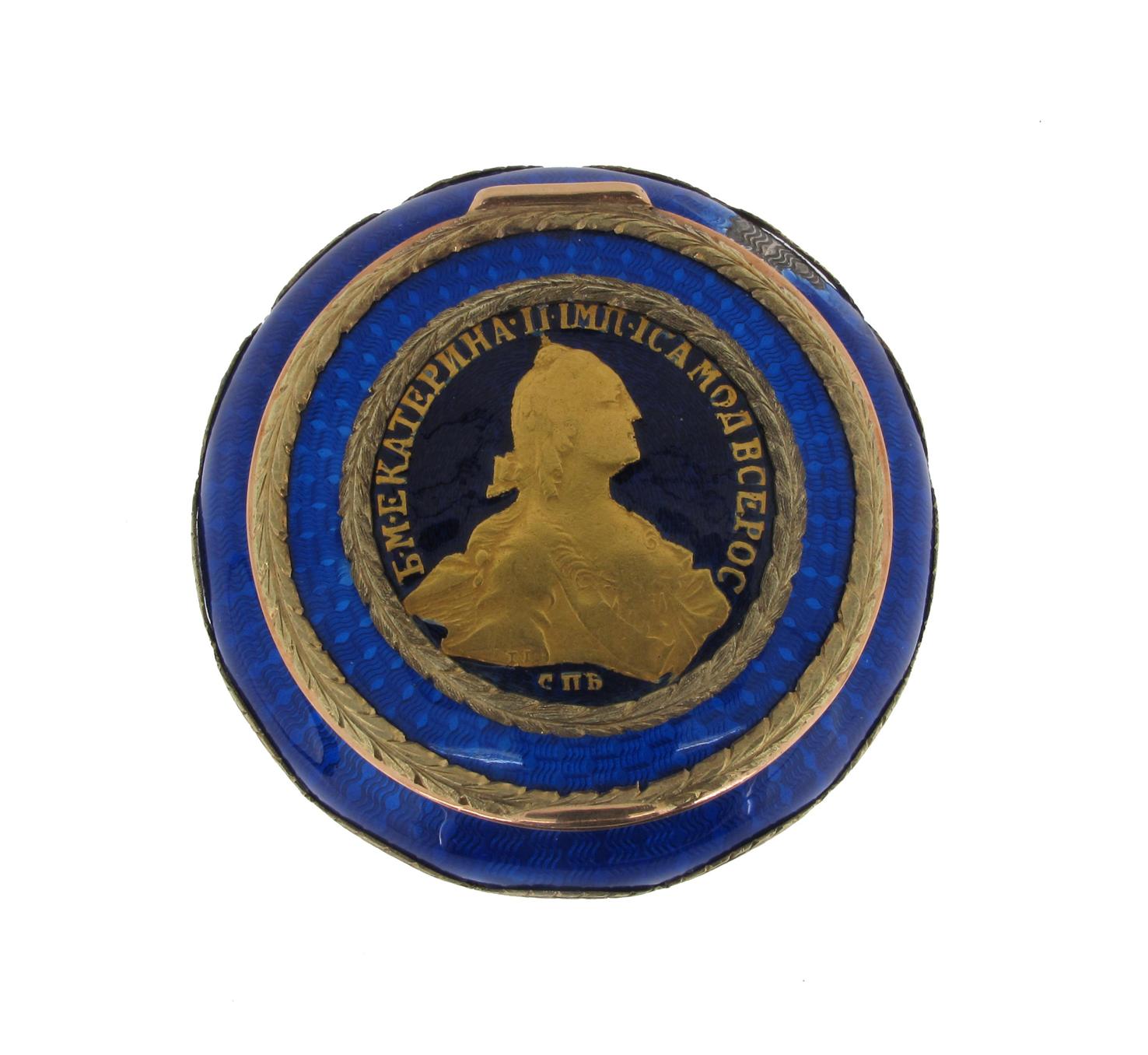 A Russian gold circular box, the hinged cover applied with a coin within laurel borders, blue guilloche enamel decoration overall. Signed Nilouram with 56 and St Petersburg marks. Damaged enamel. 5.5cm wide.