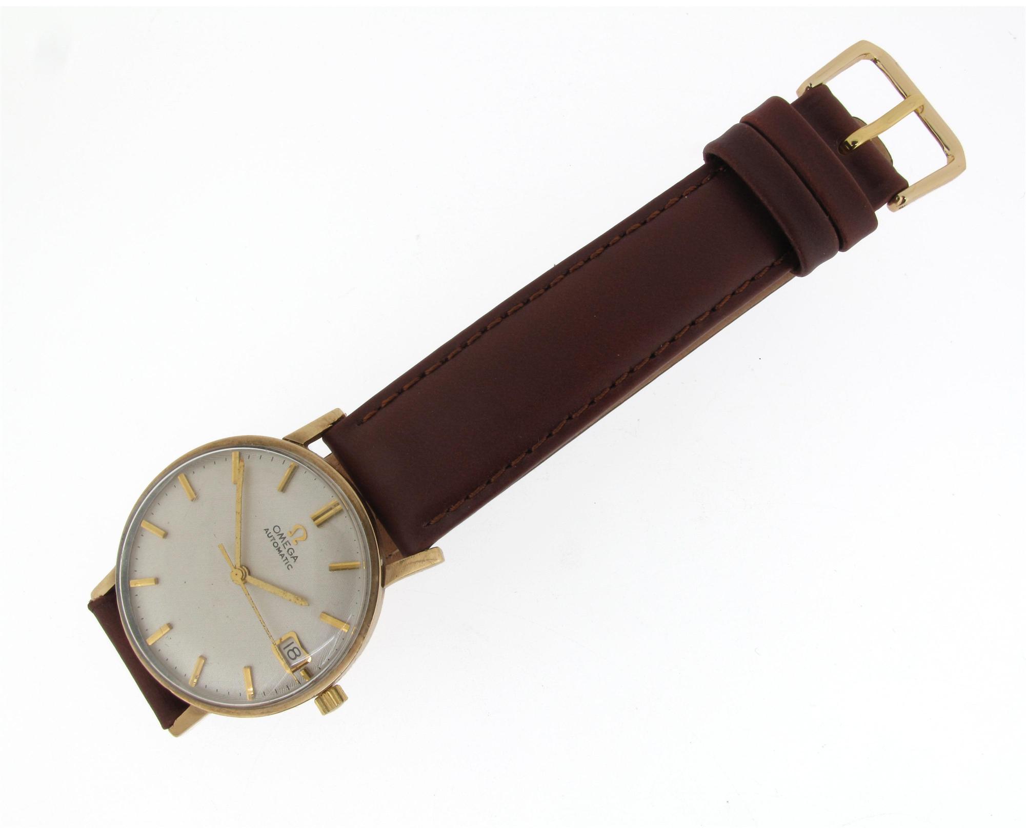 A 9ct gold wristwatch by Omega, signed dial with sweep seconds hand and date aperture, automatic movement. Leather band. 4cm including lugs.