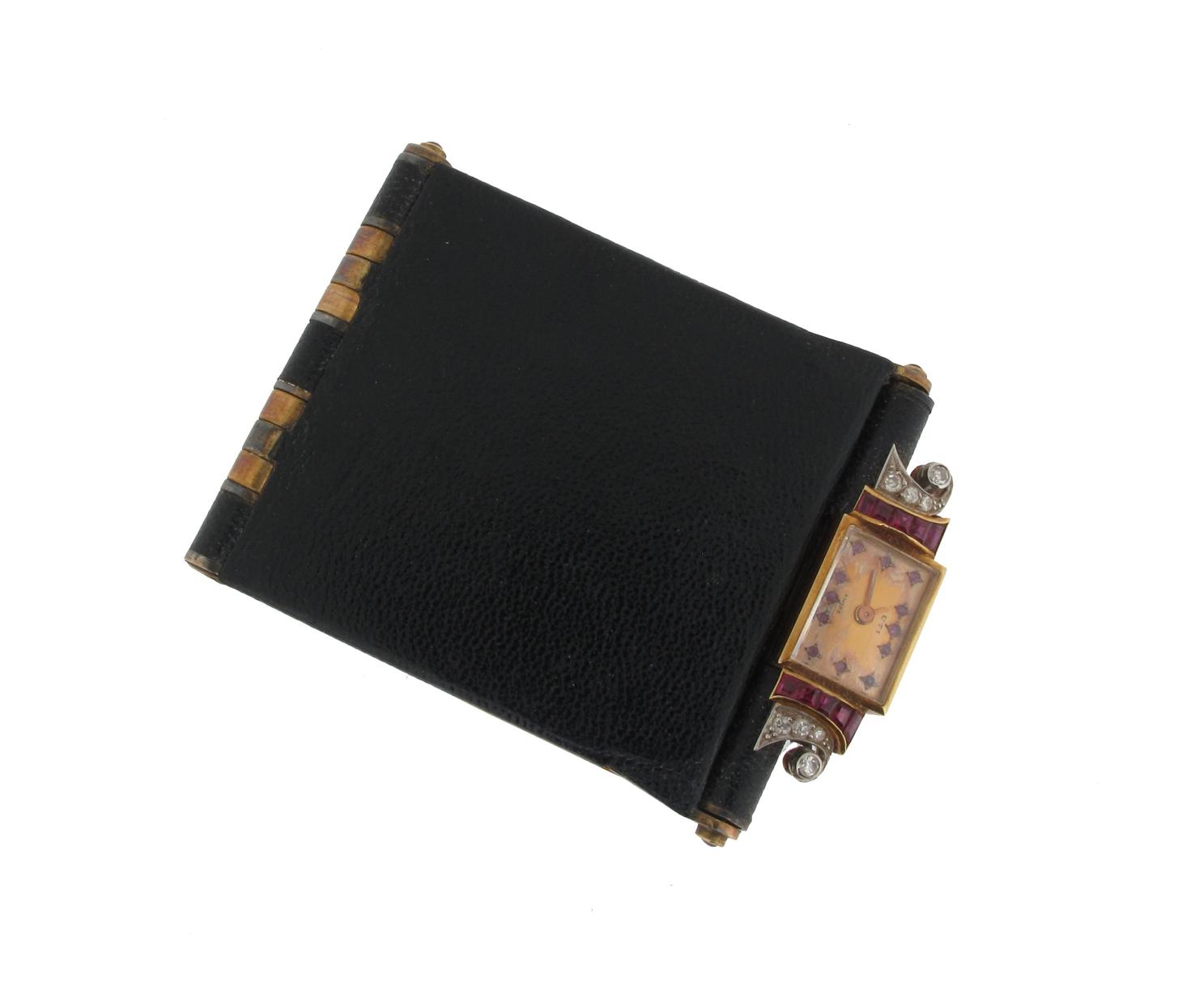 A gold framed hinged double photograph frame. Set with cabochon rubies (one missing, the thumbpiece incorporates a rectangular watch signed Uti (???) with ruby numerals and the shoulders set with rubies and diamonds. The watch missing the winder and broken from the body, leather bound. Circa 1930. 6.4cm x 4.5cm.