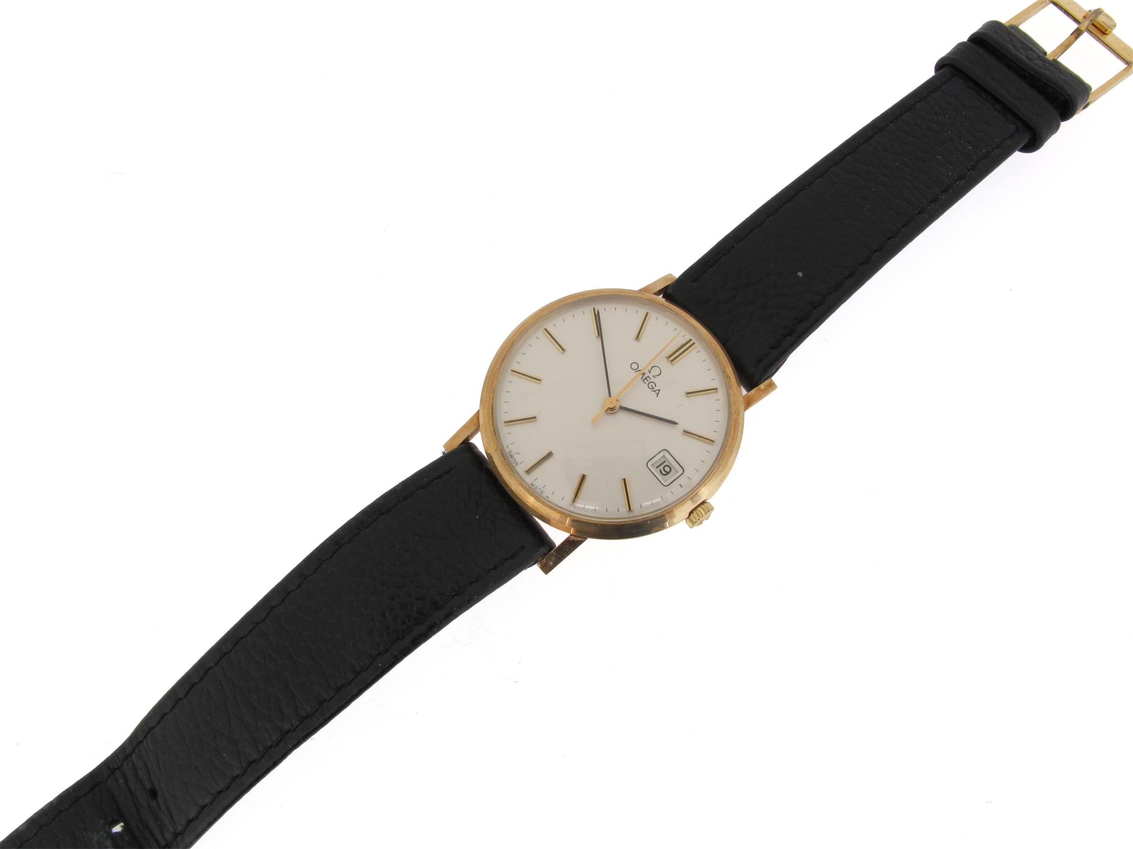 A gold wristwatch by Omega, the signed white dial with date aperture and sweep seconds hand. Engraved to the reverse. Leather strap, case.
