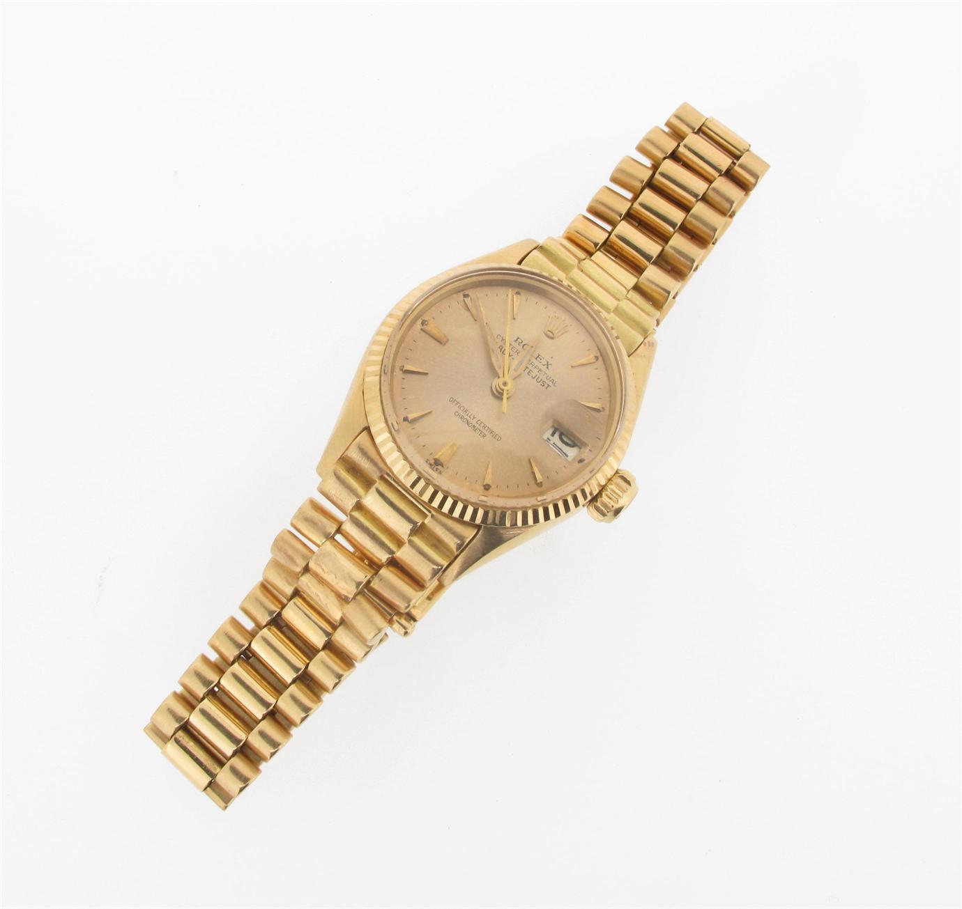 A lady's gold wristwatch by Rolex, the gold dial signed Oyster Perpetual Ladies Datejust. Date Aperture and sweep seconds hand. 18ct yellow gold Rolex band. The deployant clasp numbered 8153. Case.