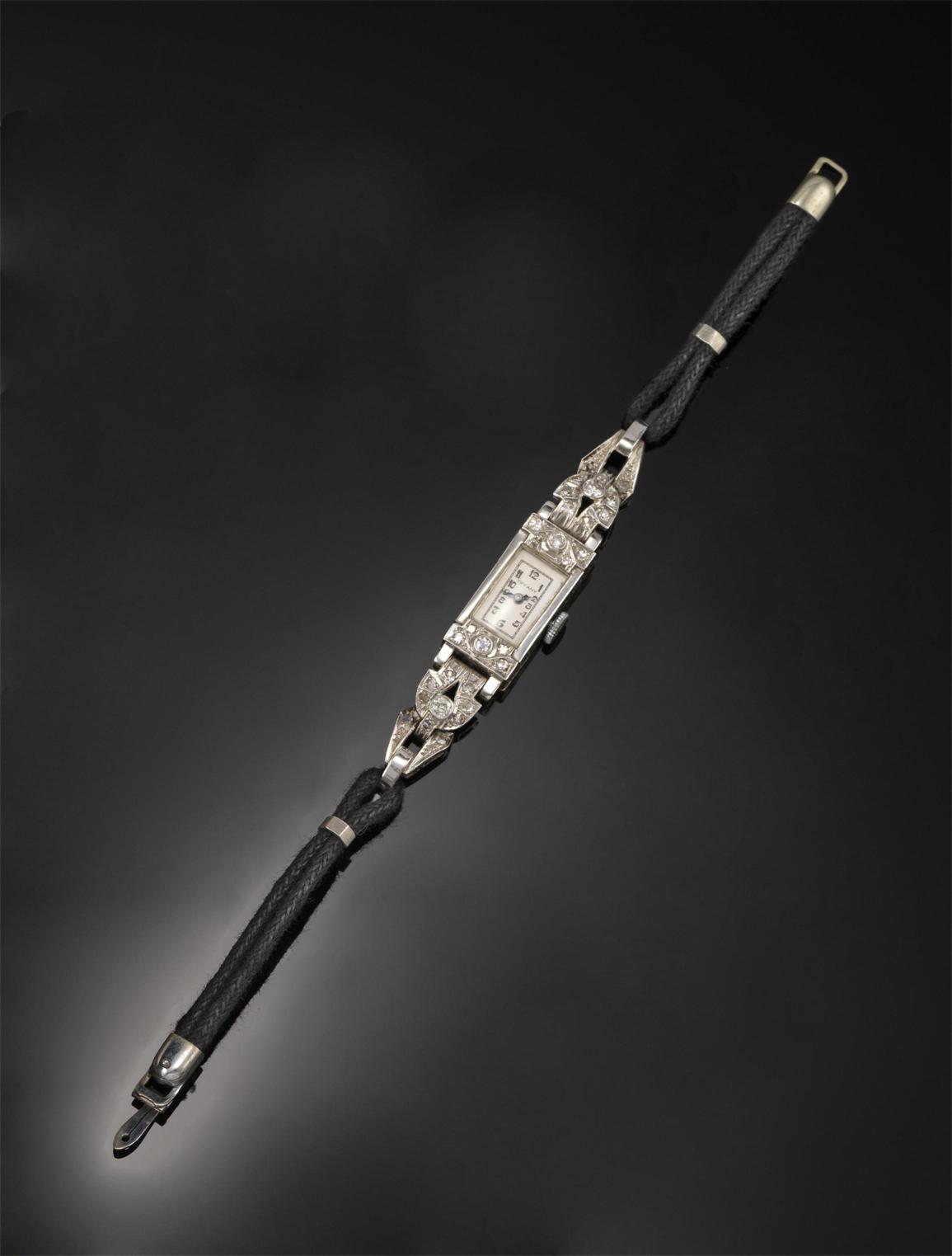 A lady's diamond set wristwatch, the small rectangular dial signed Tiffany. The case and shoulder set overall with graduated circular cut diamonds, with cord band.