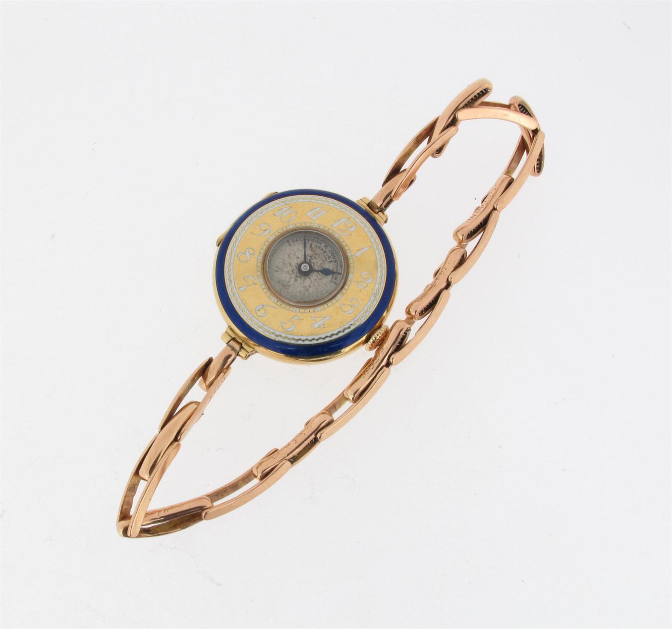 A lady's gold wristwatch by Vacheron & Constantin. Half-hunting cased the blue and white enamel borders. Gold expanding band.