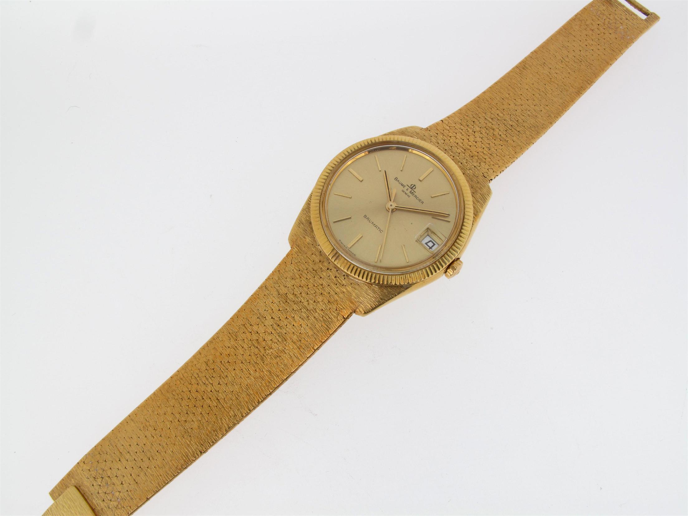 A gold wristwatch by Baume & Mercier. Baumatic model with automatic movement. Date aperture and centre seconds. Gold integrated band.