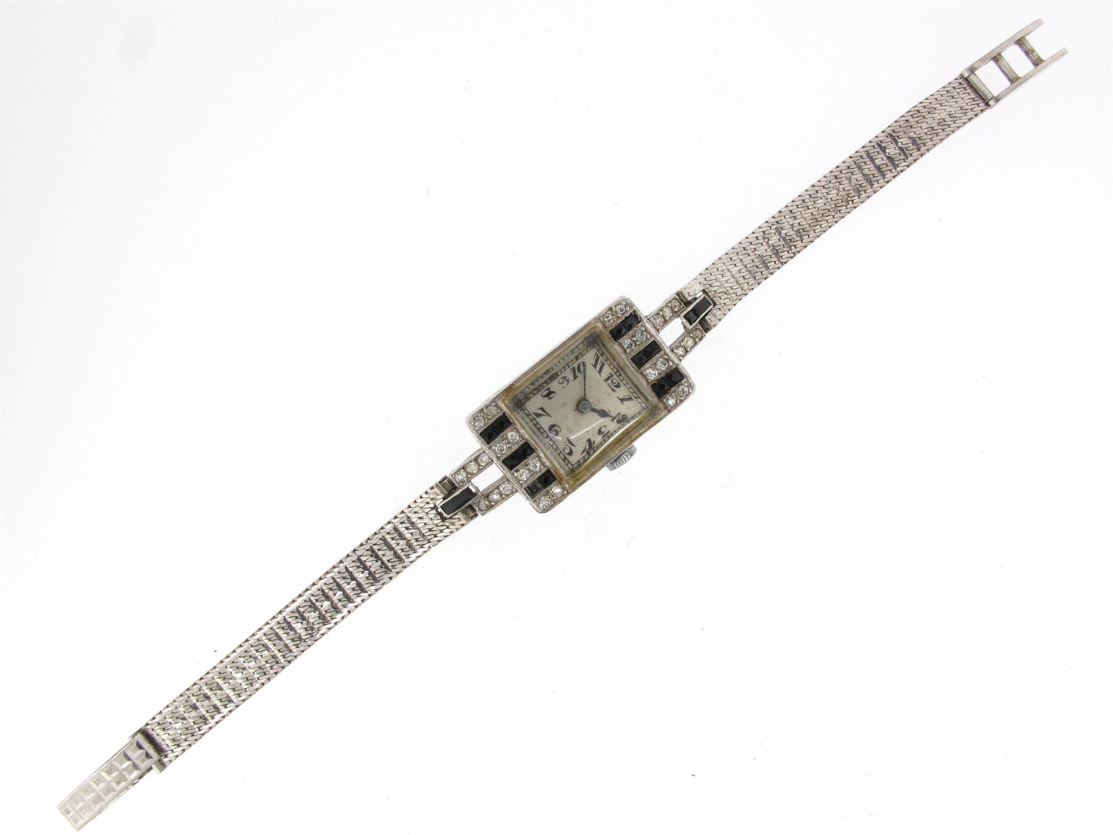 A ladies Art Deco wristwatch by Patek Philippe. The rectangular silver dial with black Arabic numerals. The shoulders set with stripes of black onyx and small circular cut diamonds. The signed movement numbered 196238, the platinum case numbered 600363. Associated white gold band.