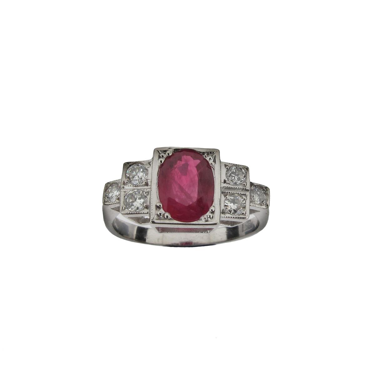 A ruby and diamond ring, the oval shaped ruby is set with three circular cut diamonds to each shoulder in white gold. Size N.