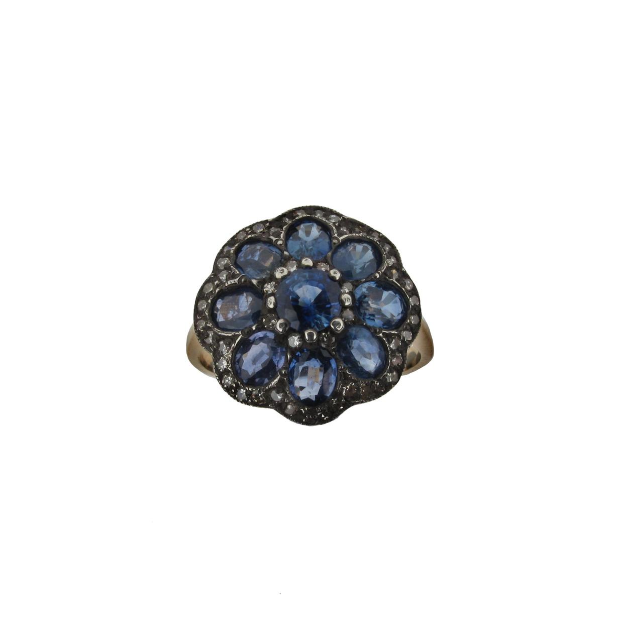 A sapphire and diamond cluster ring, the stylized flower head is set with oval shaped sapphires and small circular cut diamonds in gold. Size M.