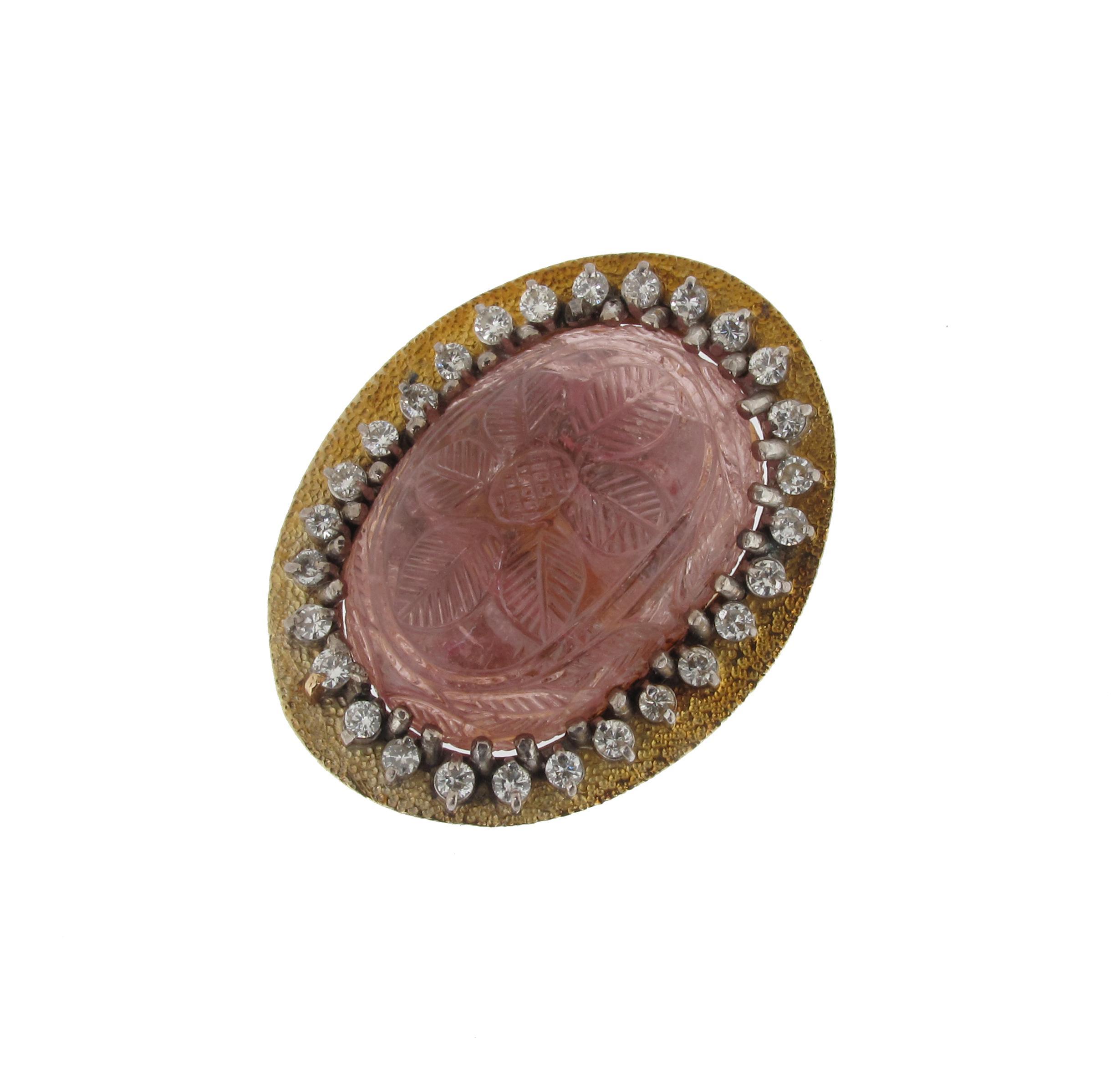 A gold ring mounted with a carved oval shaped pink cabochon stone, within a surround of small diamonds. 33g in total. Size L.