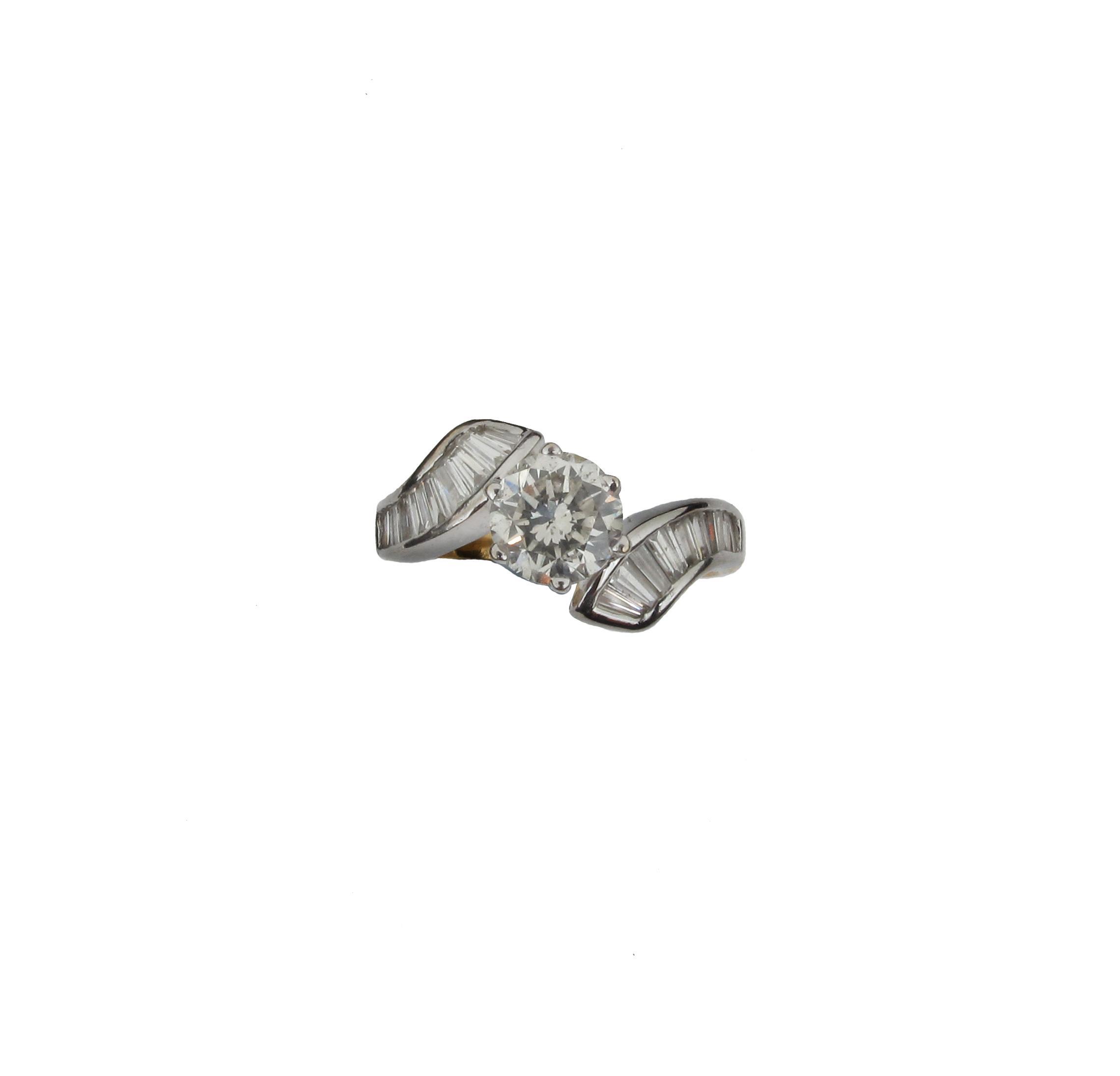 A diamond solitaire ring, the circular cut diamond is set with tapered baguette shaped diamonds to the shoulders in 18ct yellow and white gold gold. Size I.