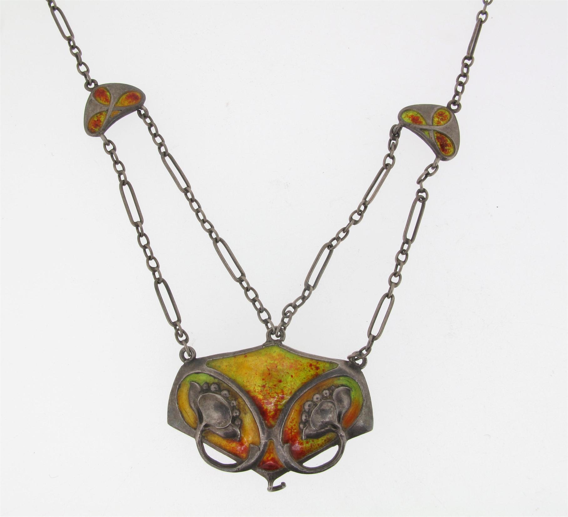 Murlle Bennett & Co, and Arts and Crafts foliate silver pendant, decorated with orange, yellow and green enamel. On fine link silver chain with two smaller sections with repeated decoration. Signed to the reverse with initials M.B.C and 950.