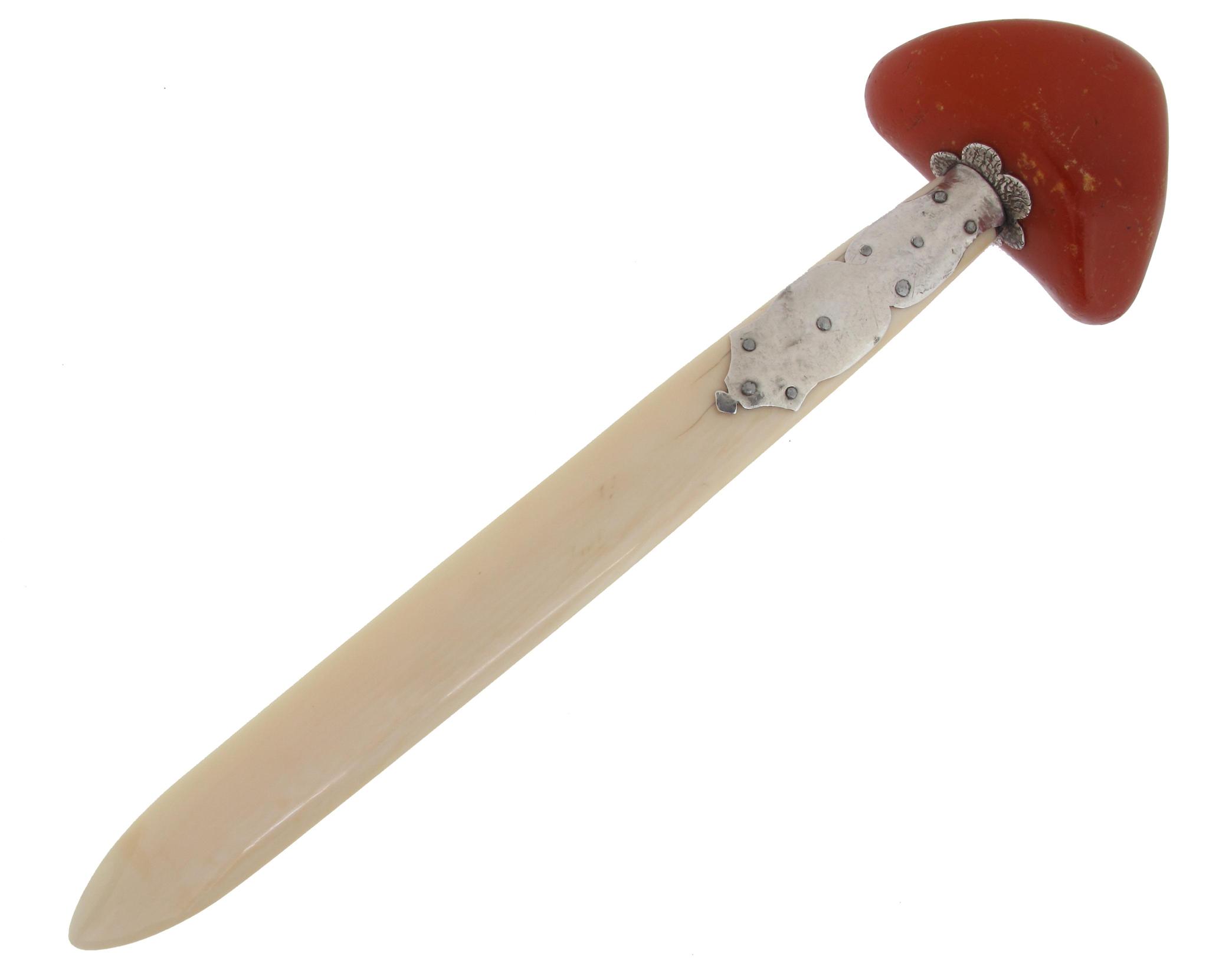 An Arts and Crafts letter opener by Murlle Bennett & Co, the ivory blade with amber terminal and the silver mount signed. 21.5cm long.