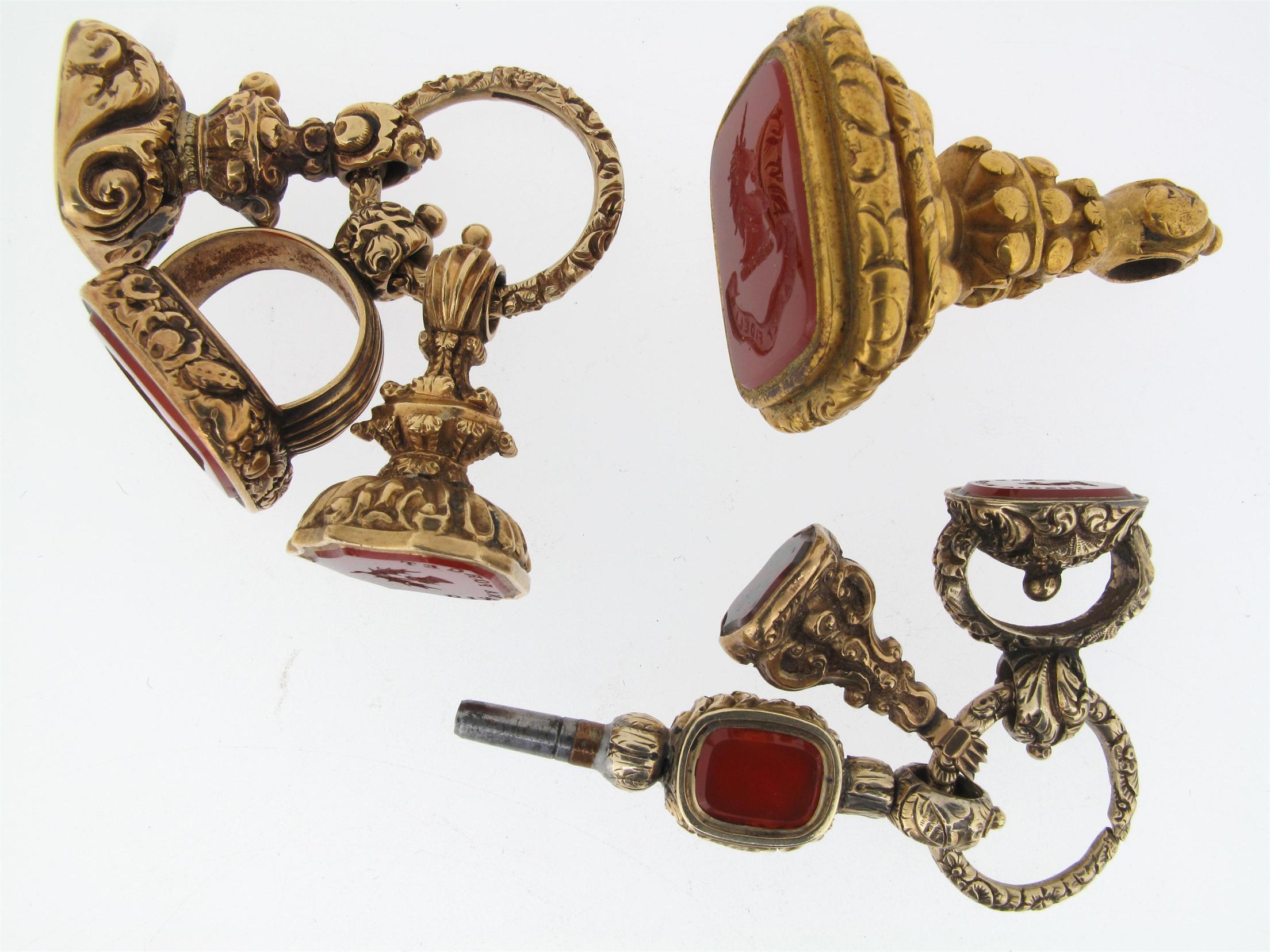 A watch key pendant mounted with two hardstones, two stone mounted miniature gold cased fob seals and a foliate scroll engraved split rings. Three hardstone mounted miniature fob seals and a foliate scroll engraved split ring and a carnelean mounted gold cased fob seal engraved with a crest and motto.