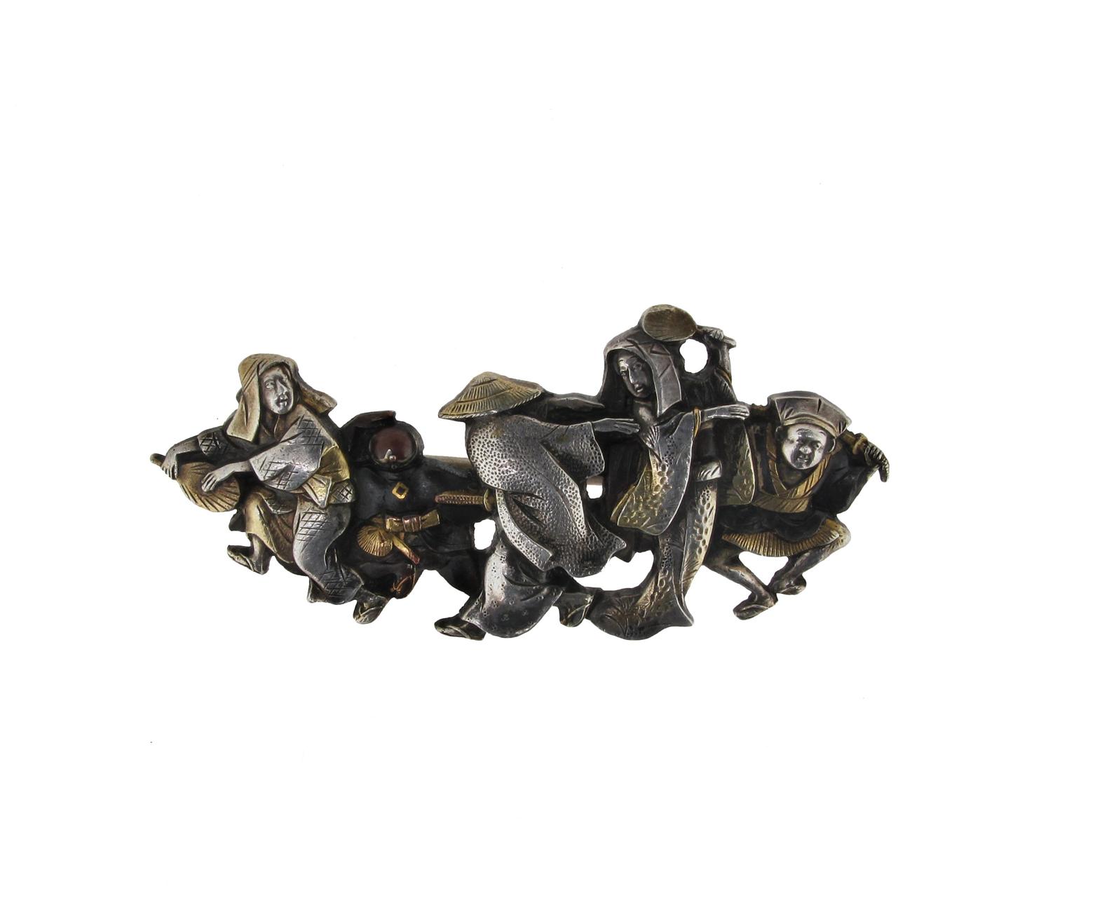 A Japanese mixed metal brooch depicting actors. 4.8cm wide.