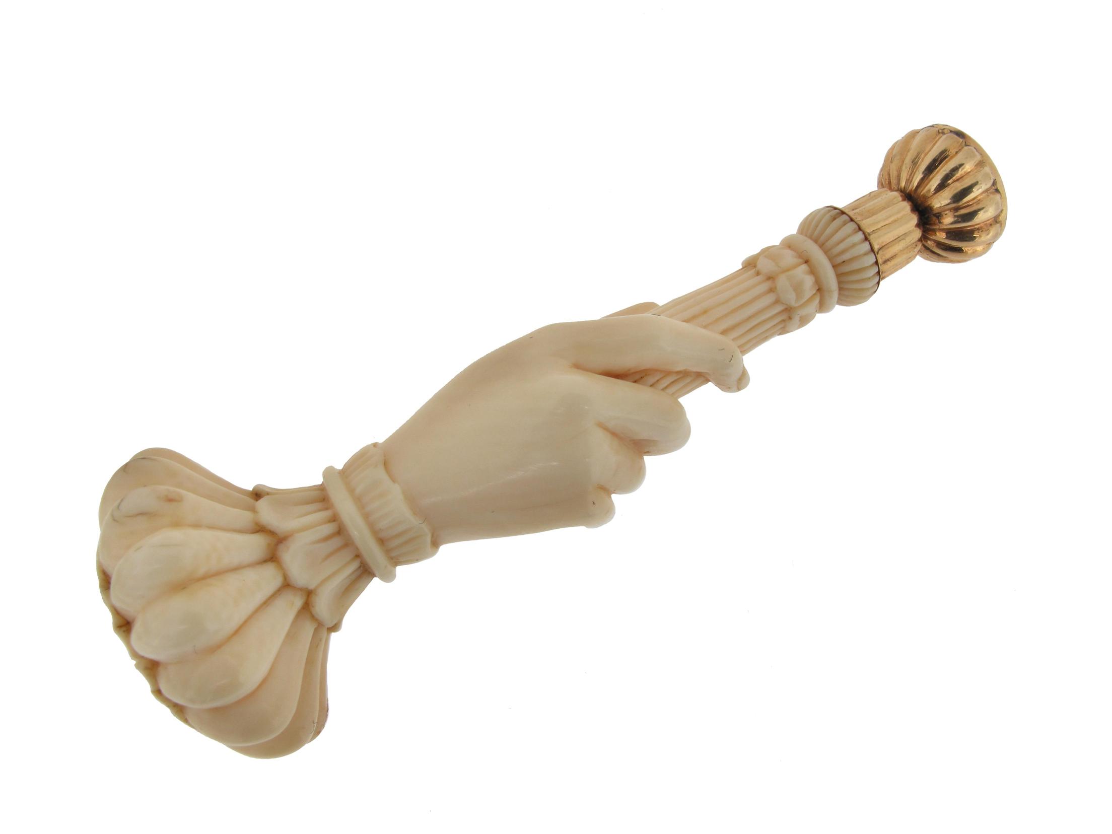 A 19th Century carved ivory seal. Carved as a hand clutching a fluted seal with circular carnelean mounted to the fluted gold joint. 8cm.