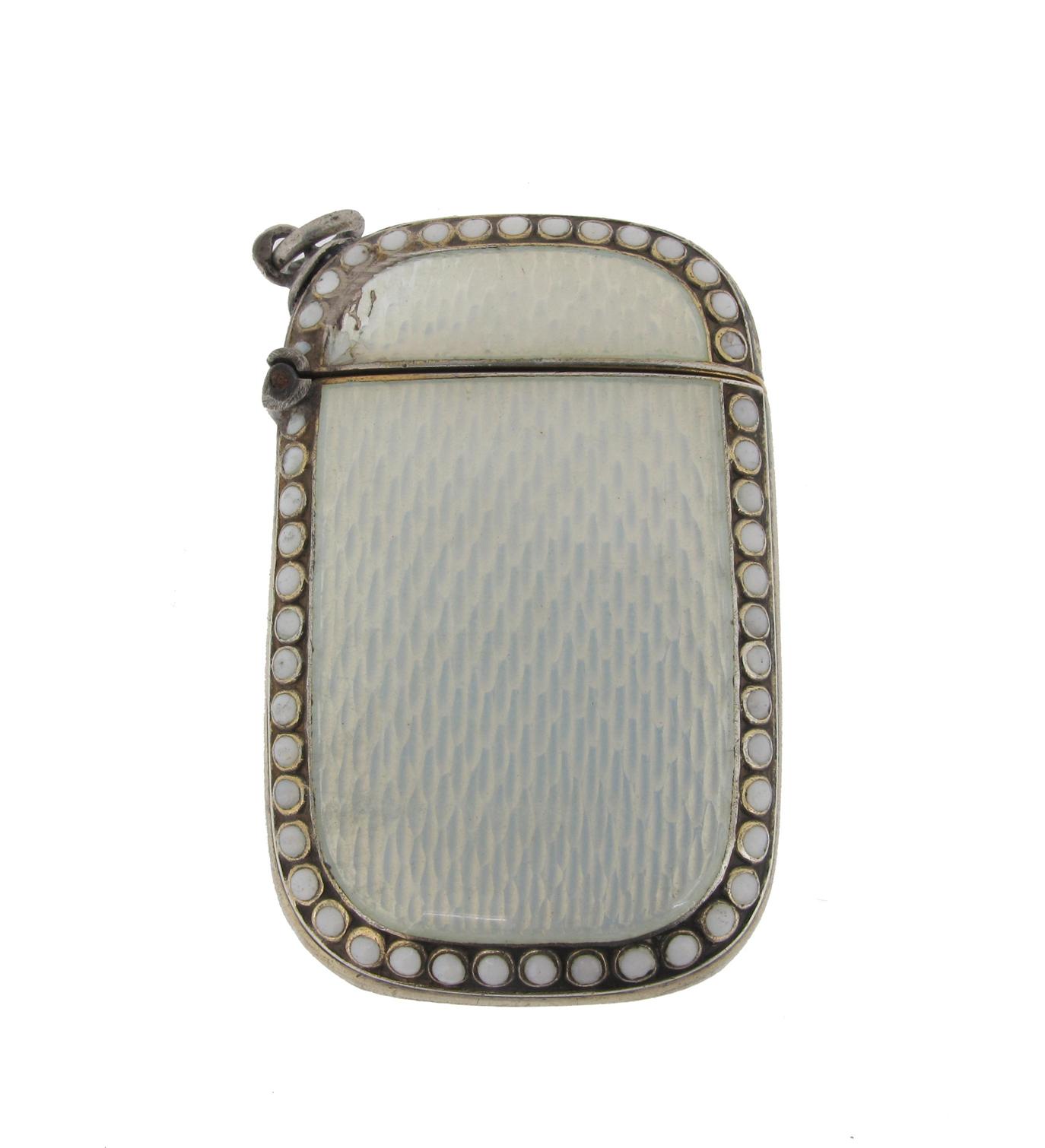 A Russian silver and enamel vesta case, of oval form and decorated to both sides with light blue guilloche enamel within a border of white enamel pellets. Bearing the marks Faberge in Cyrillic and 88 zolotnik mark. Striker to base. 4.5cm high.