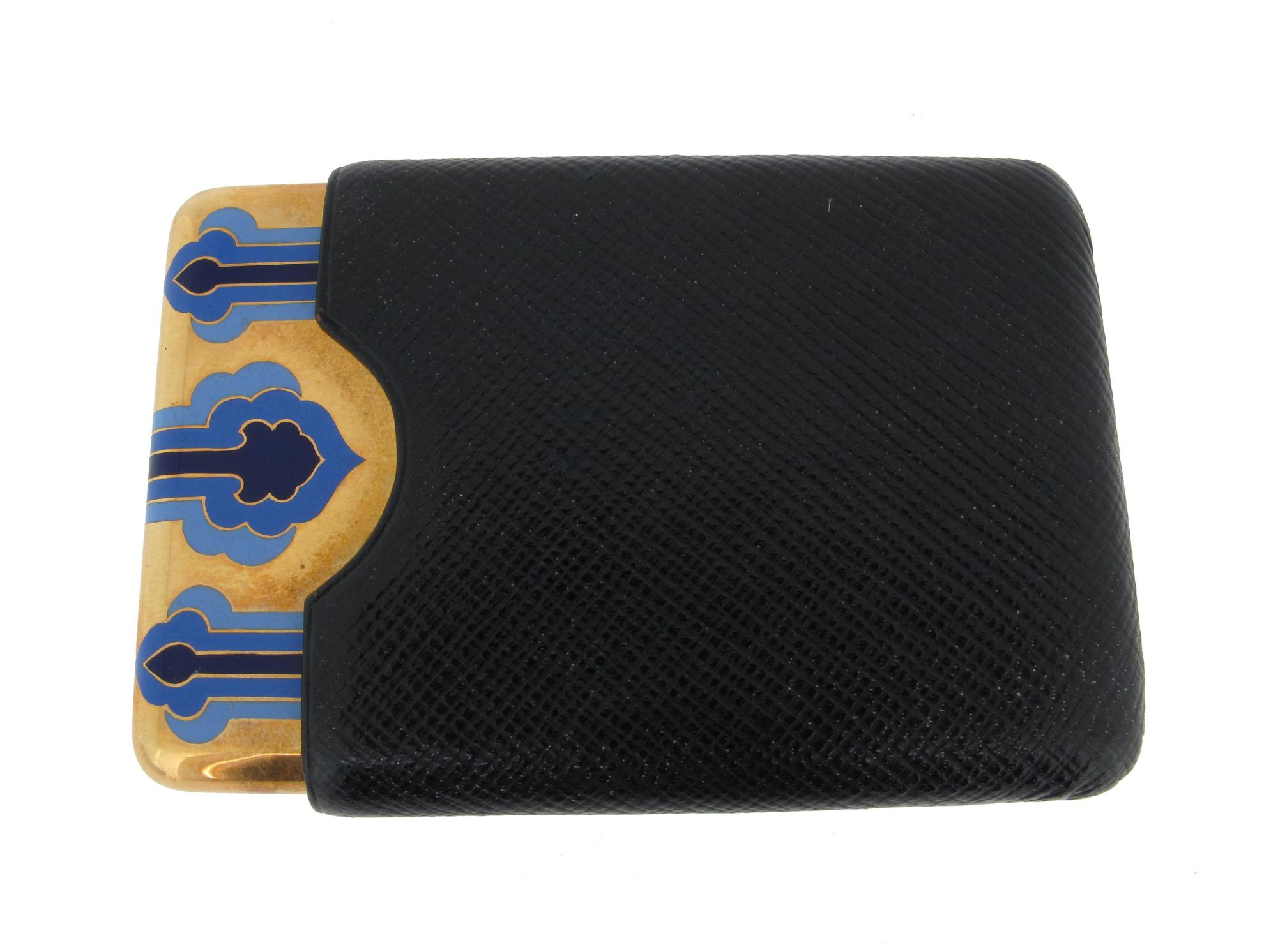Janesich. An Art Deco 18ct gold card case, with blue enamel geometric decoration. Signed and numbered 12009. Import marks for London 1928. French control mark. 52g (gold) with leather cover.