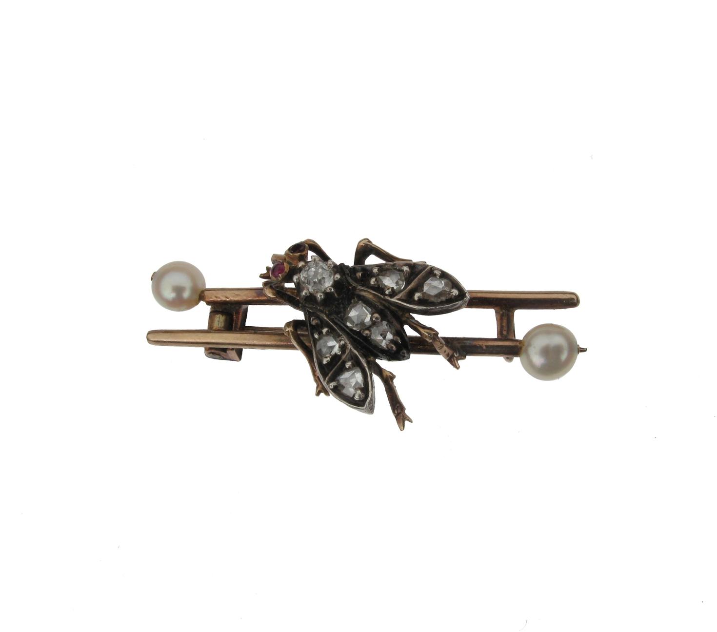 A gold bar brooch with pearl terminals, mounted with a diamond set bee with cabochon ruby eyes in silver and gold. 3.2cm wide.