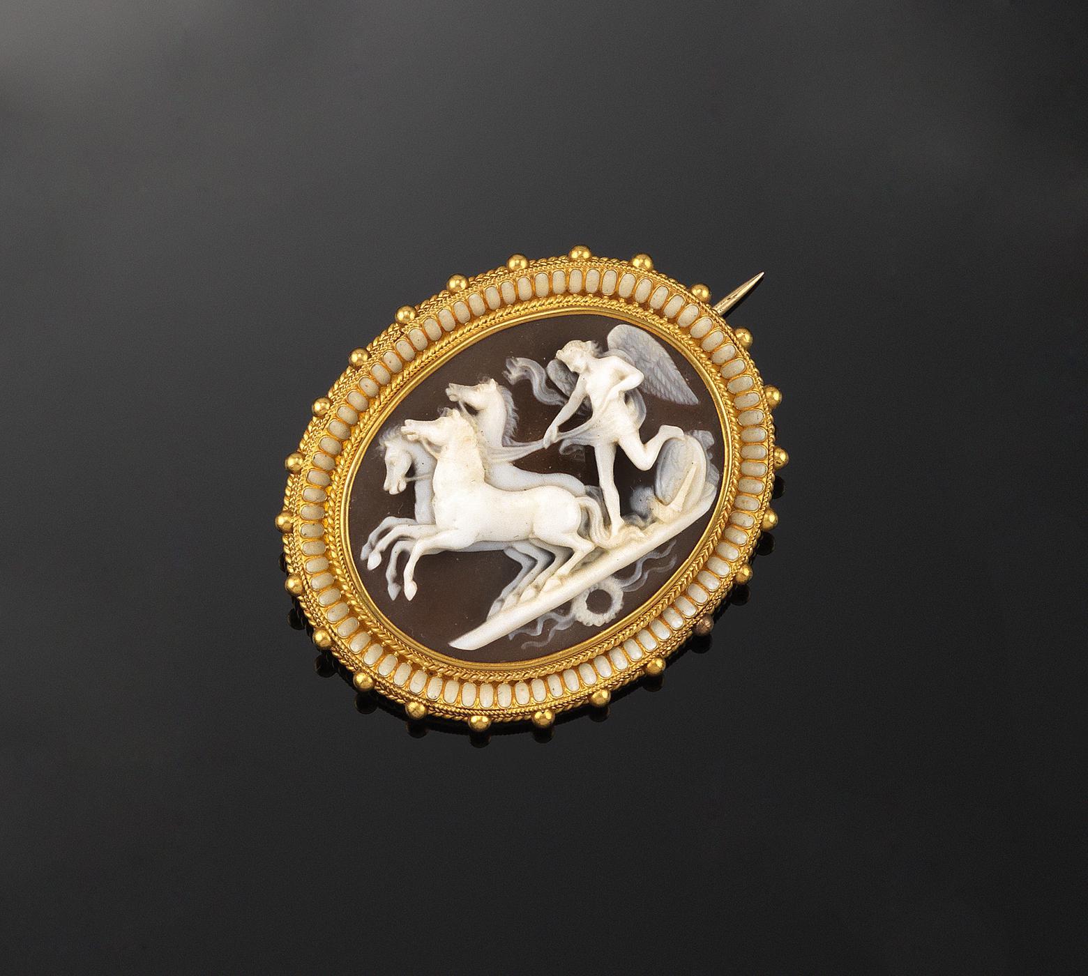 A 19th Century carved shell cameo brooch, depicting Phoebus and his horses on a gold Etruscan style frame with white enamel pellet border. The cameo 3.5cm wide.