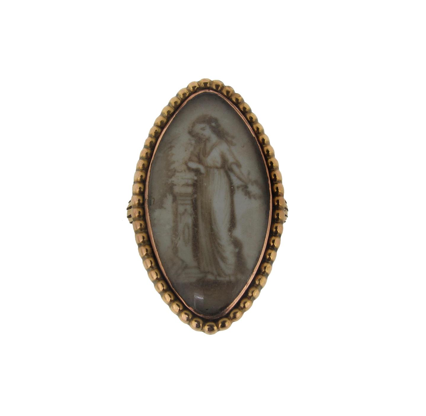 A George III marquise shaped mourning ring, depicting a girl leaning on a pillar, gold closed back mount and shank. Size K.