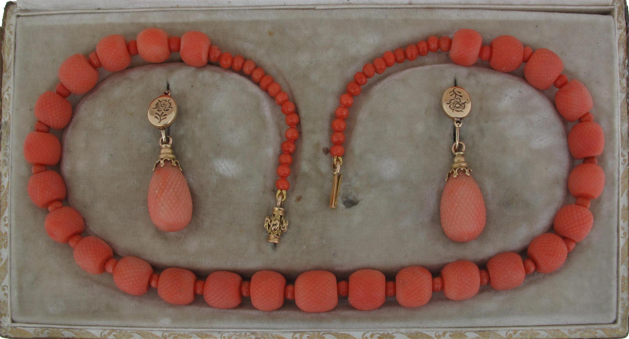 A 19th Century coral necklace, formed with engraved barrel form coral beads each separated with a smaller coral bead with gold clasp. Fitted case.