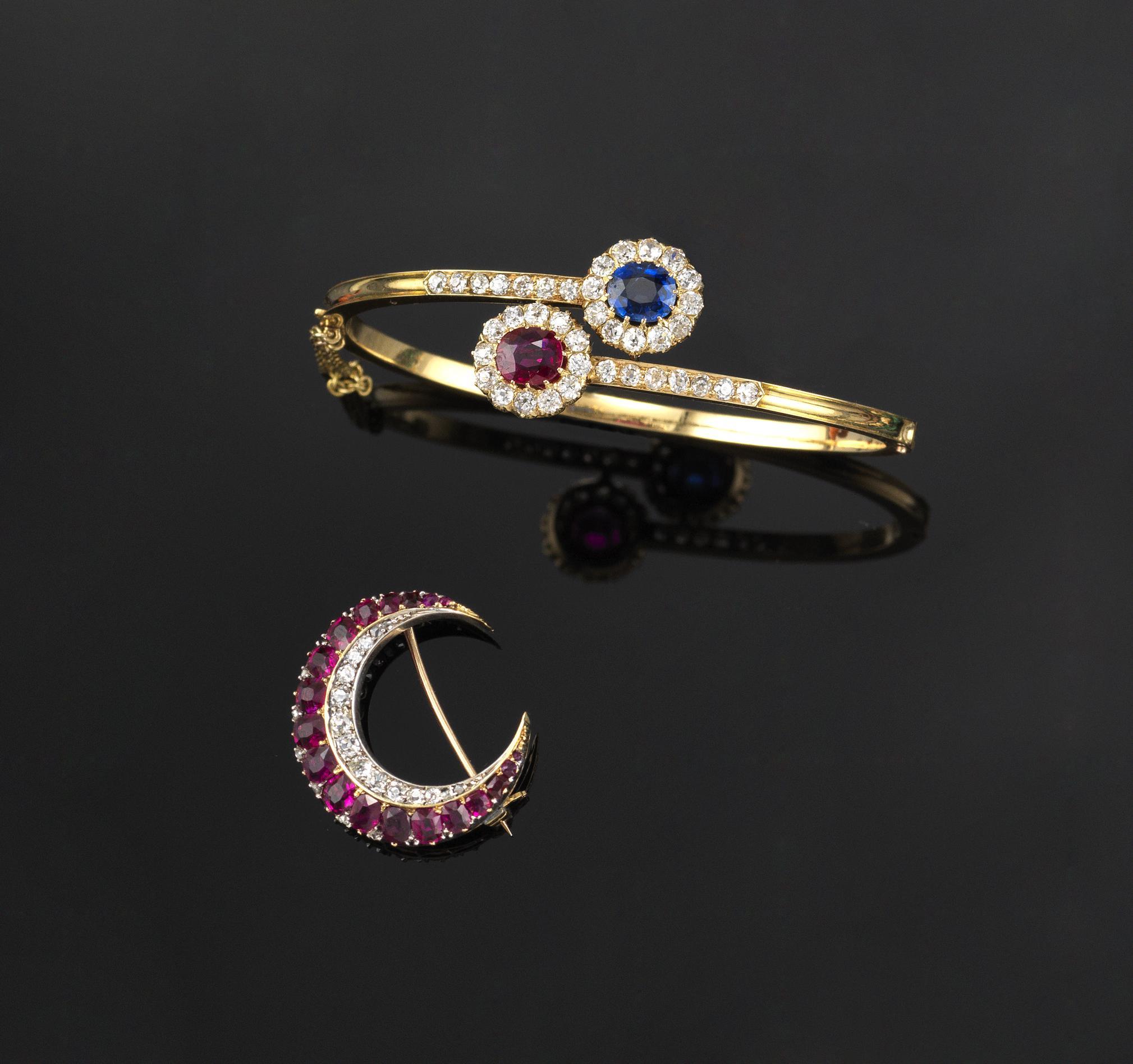 A late Victorian gold open bangle, the terminals set with diamond clusters, centred with a sapphire to one side and a ruby to the other. With a ruby and diamond set gold closed crescent brooch. Cased.