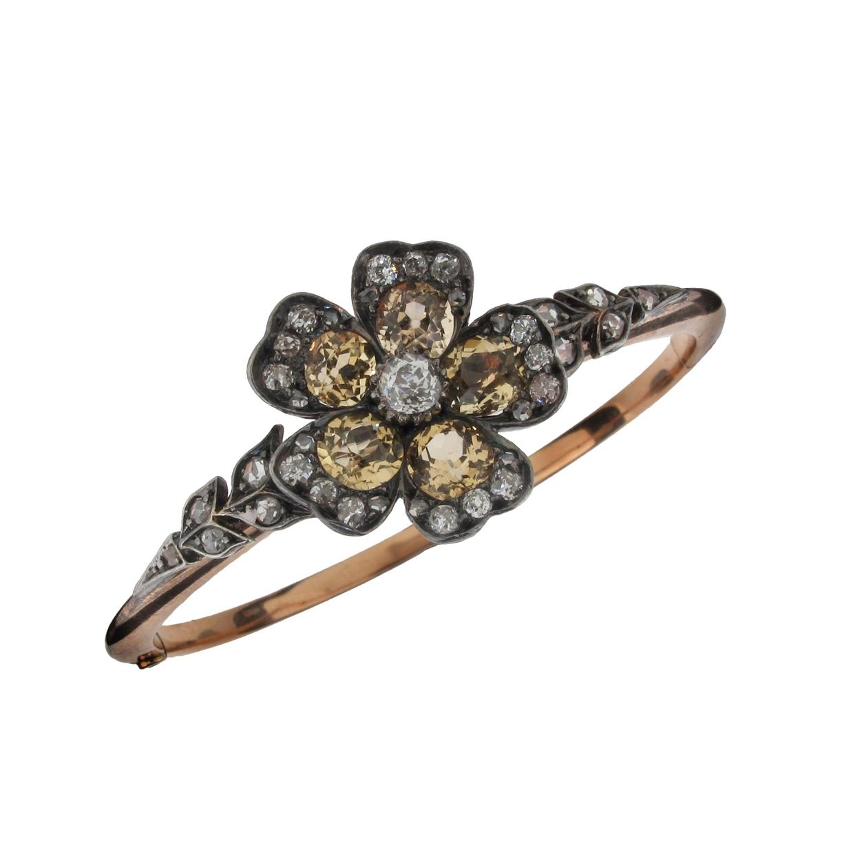 A Victorian flower head mounted hinged bangle, the petals are each set with a yellow stone and smaller diamonds with further smaller diamonds to the foliate shoulders, set in silver and gold.