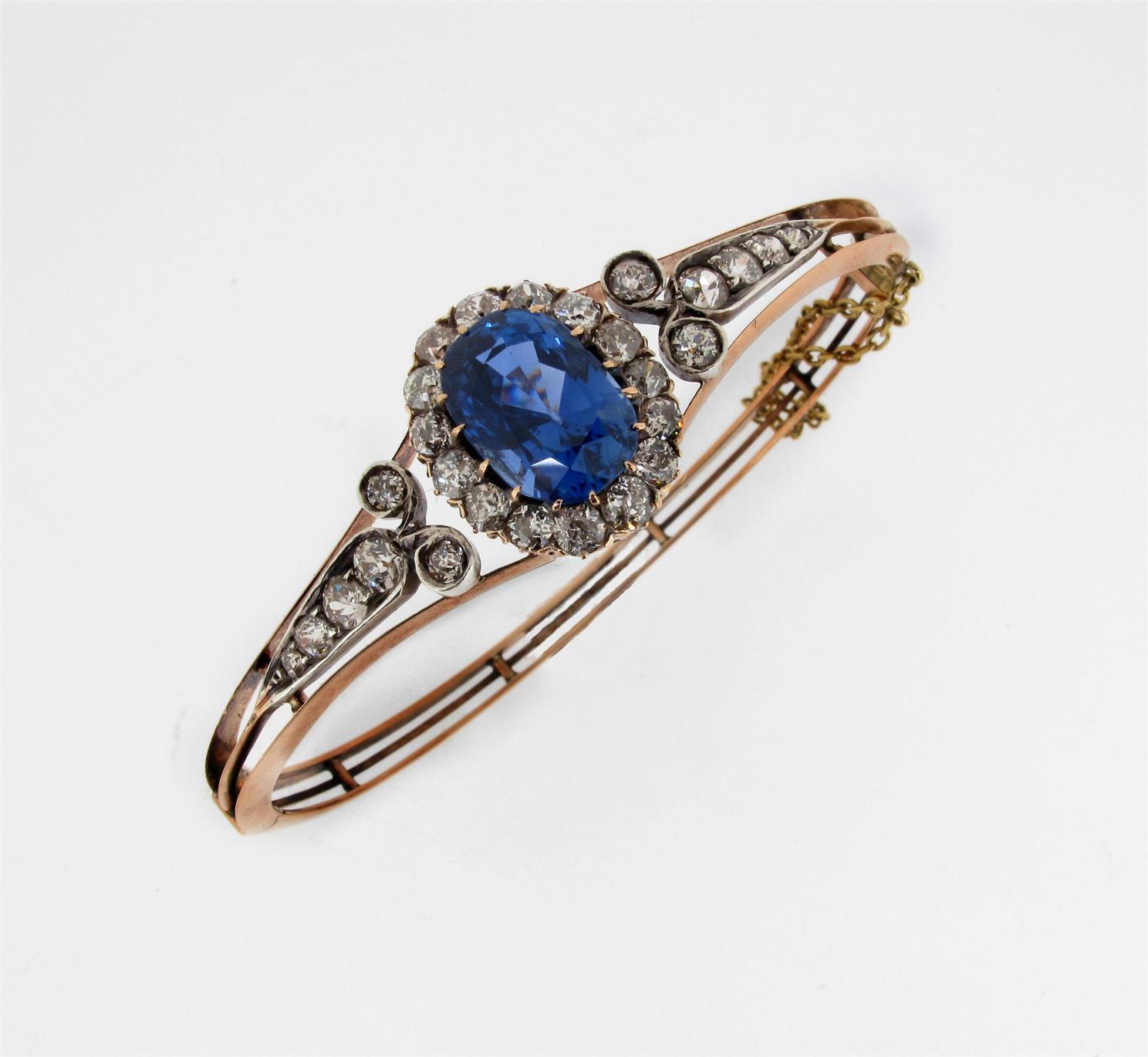 A Victorian sapphire and diamond set gold hinged bangle, the oval shaped sapphire is set within a surround of fifteen old circular cut diamonds with further diamonds set to the shoulders.