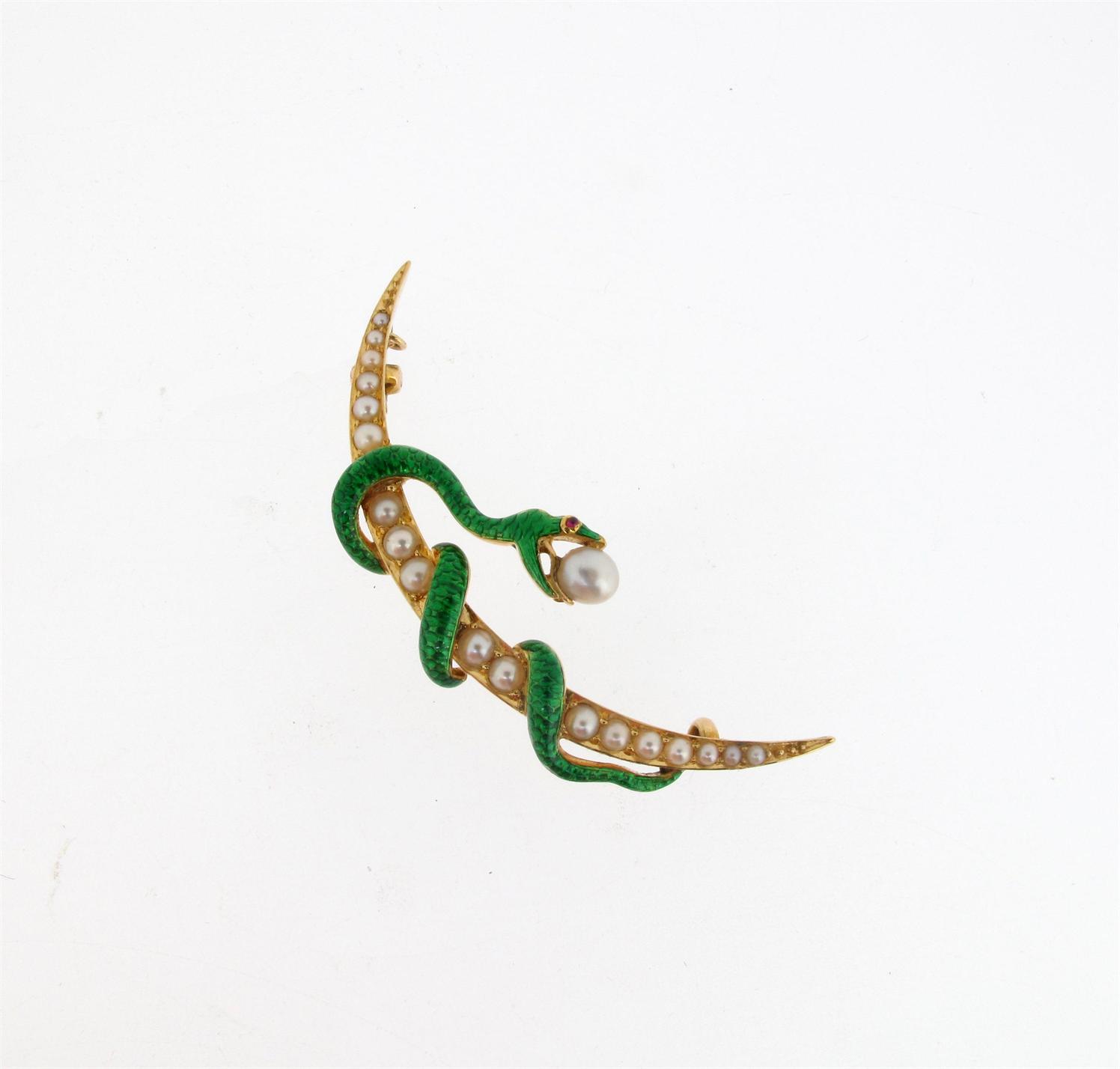 A Victorian snake and open crescent brooch, the snake decorated with green enamel with ruby eye and holding pearl in its mouth. The gold crescent set with graduated seed pearls, 4.7cm.