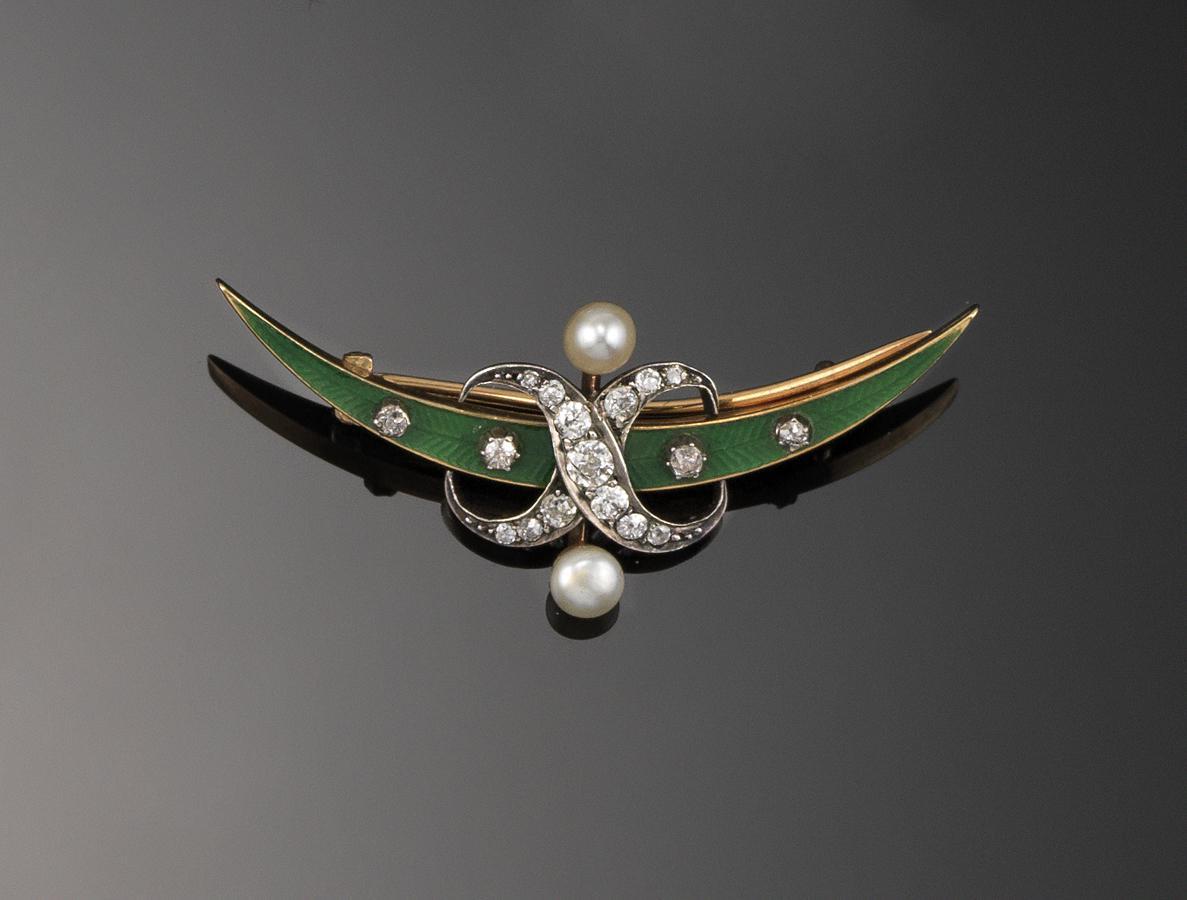 A diamond and and pearl set gold crescent brooch, set with graduated diamonds and two pearls with green guilloche enamel decoration. 4.5cm wide.